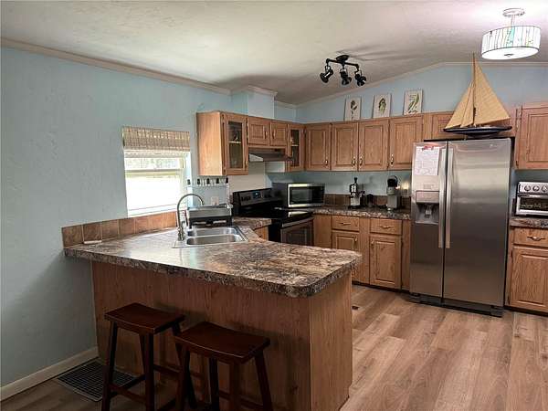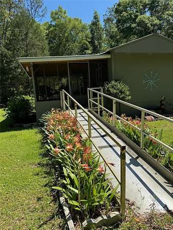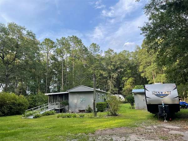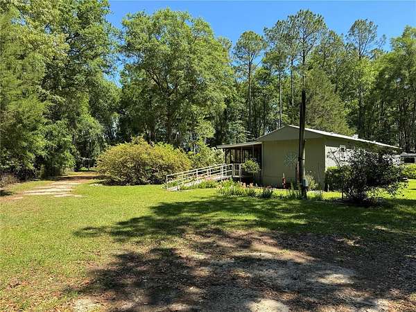 Welcome to peaceful country living minutes from charming downtown High Springs! This well-maintained 2-bedroom, 1-bath manufactured home is nestled on a beautifully landscaped 5-acre homesite, surrounded by pine and oak trees, splendid camellias, vibrant azaleas and even a mature fig tree. Set back from the road, this property offers privacy and serenity, all just minutes from modern conveniences, the University of Florida and hospitals including HCA North Florida and UF/Health Shands. Inside, you'll find a spacious feeling floor plan with durable luxury vinyl plank (LVP) flooring throughout, perfect for easy living. The home is equipped with a handicap-accessible ramp leading to a screened-in front porch, ideal for enjoying quiet mornings or relaxing evening. The property also includes outdoor plugins for an RV and an outbuilding for your tools and equipment. Whether you're looking for a peaceful retreat or a move-in-ready homestead, this home offers it all.