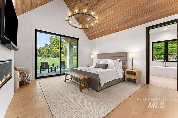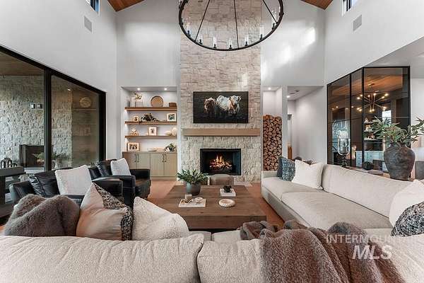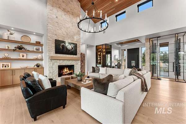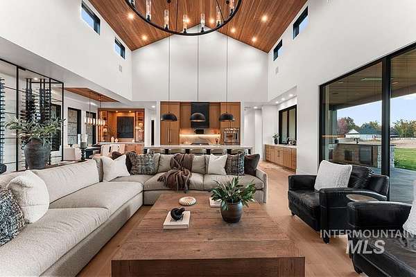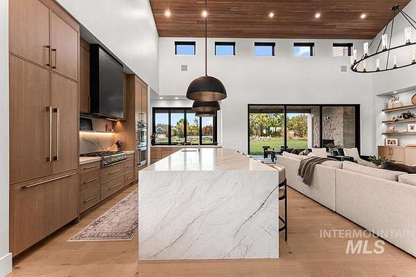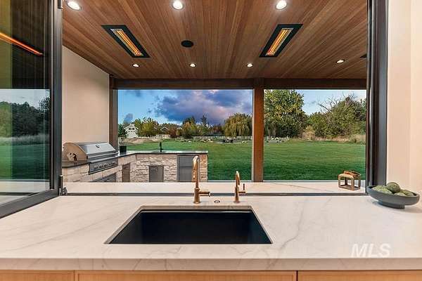 A legacy custom built estate on 2.4 acres with no HOA on a setting that eclipses tranquility. A long intimate driveway set back off the street with grounds featuring a private pond, expansive lawn, mature trees & BMX track. Expansive single level design with 23' cathedral wood ceilings & a sweeping open layout frame panoramic views of the acreage through the wall of glass doors. The showpiece kitchen features honed quartzite countertops, custom ceiling-height cabinetry, & premier Thermador appliances. The butler's pantry offers secondary appliances & abundant prep space, while the kitchen itself fully opens to an outdoor bar overlooking the patio. Grid-lined statement glass doors enclose a striking wine cellar & an executive-level office. The master suite occupies its own wing, with cathedral ceilings, gas fireplace, patio access, & luxe bath with a spacious walk-in closet. The remaining bedrooms sit on the opposite wing, each with its own private bath. The upper level offers a rec room & a flex space for a home gym, or option to convert to a 5th bedroom. The exceptional patio features Infratech heaters, a dual gas/wood-burning floor-to-ceiling fireplace, & a fully equipped outdoor kitchen. Enjoy recreation on the BMX track or unwind beside the 15-foot-deep pond stocked with fish. A truly unparalleled estate. RV parking! Building plans for a pool and RV garage available!
