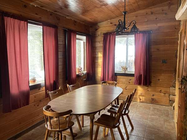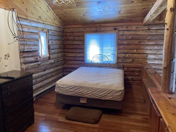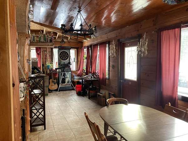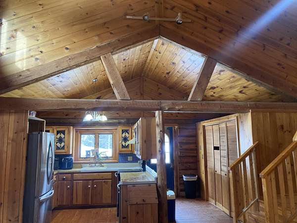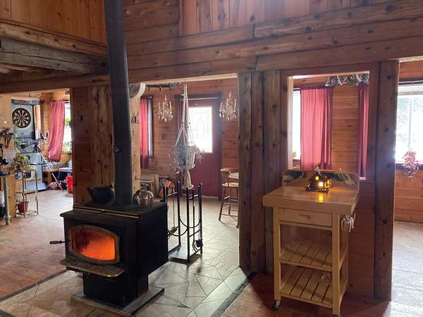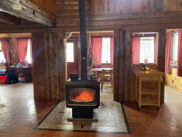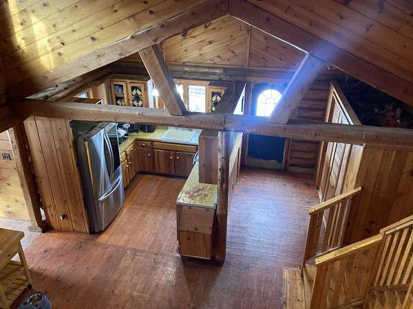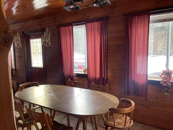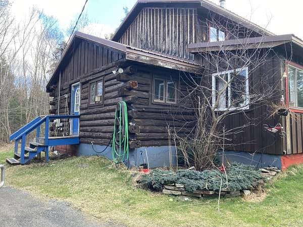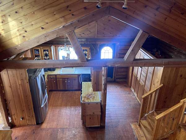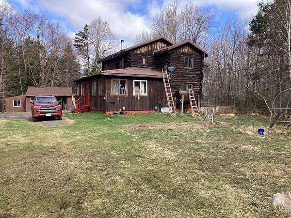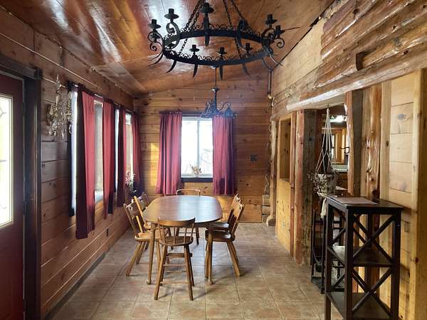 Get back to nature in this log home located on 5 acres with trails and a stream running through it. Just far enough the road for quiet and privacy. The home boasts a beautiful open concept with cathedral ceilings and open log beams. The loft has a large bedroom, full bathroom and large closet. A second sleeping area is 2 built-in bunks on the main level. The main level has a kitchen open to the huge great room with a woodstove for comfort. The dining room/game rooms have lots of windows looking out upon the meadow and woods. There is a poured foundation attached to one side, ready for your expansion. Blueprints available for a master suite. An oversized garage will store all your toys. Additional 3 acres could be available. Owner burns 10 face cords and $500 kerosene annually.