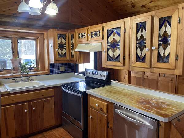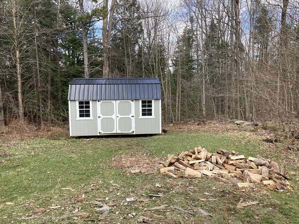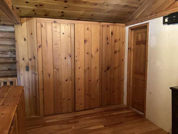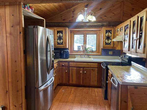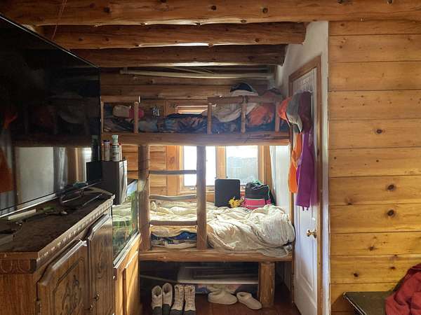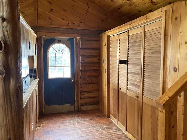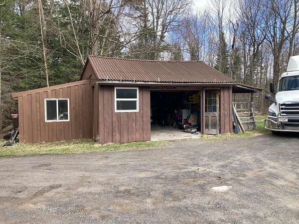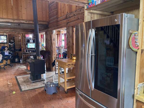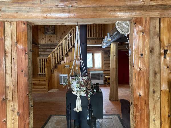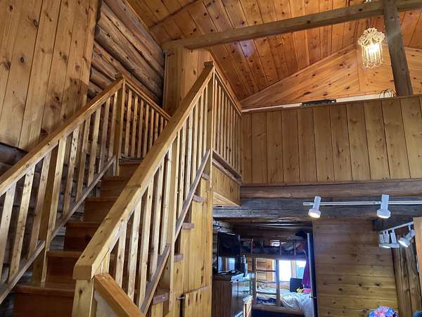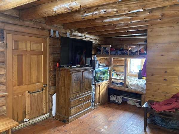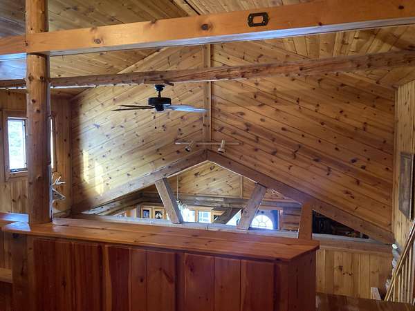 Get back to nature in this log home located on 5 acres with trails and a stream running through it. Just far enough the road for quiet and privacy. The home boasts a beautiful open concept with cathedral ceilings and open log beams. The loft has a large bedroom, full bathroom and large closet. A second sleeping area is 2 built-in bunks on the main level. The main level has a kitchen open to the huge great room with a woodstove for comfort. The dining room/game rooms have lots of windows looking out upon the meadow and woods. There is a poured foundation attached to one side, ready for your expansion. Blueprints available for a master suite. An oversized garage will store all your toys. Additional 3 acres could be available. Owner burns 10 face cords and $500 kerosene annually.