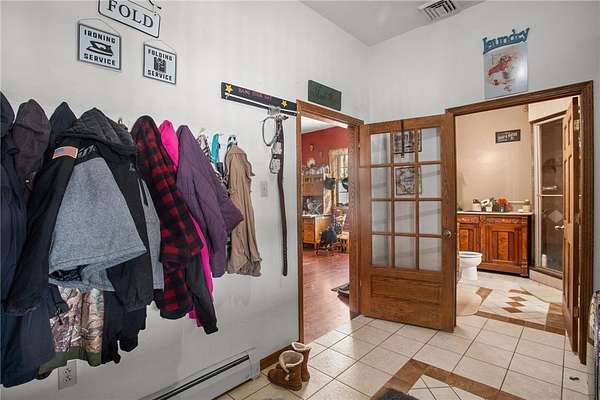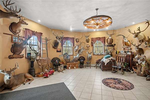 Upstairs, five spacious bedrooms with 8' ceilings provide comfort and privacy. The primary suite offers a walk-in closet, sitting area, walk-in ceramic tile shower, and tranquil views of the surrounding landscape. A 10-ton heat exchanger services the upper level, complemented by first-floor hot water baseboard heating and central air for year-round comfort.