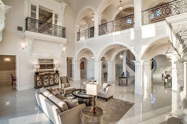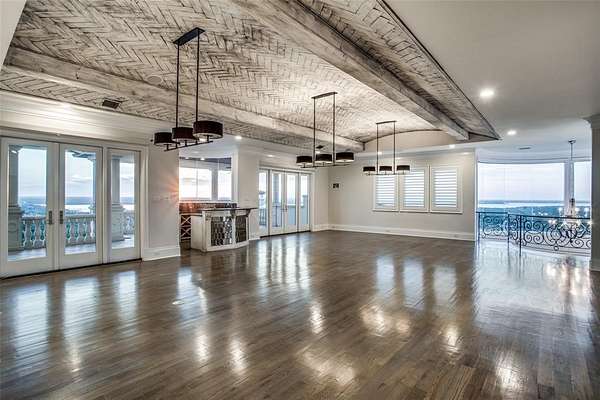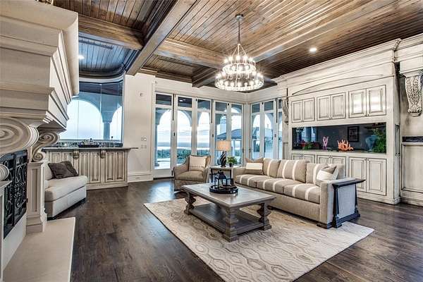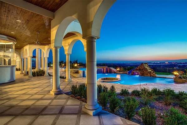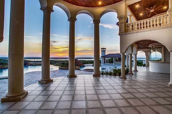 A once in a lifetime opportunity to own an elegantly intimate masterpiece sitting atop one of the highest points for hundreds of miles, with panoramic views! Spectacular views of the lake, Fort Worth, Las Colinas, AT&T Stadium! Designed for a luxurious lifestyle, the magnificent mansion features 8 bedrooms, 8.2 baths, 3 floating staircases, a resort style pool featuring two grottos, waterfalls and water features, a sunken fire pit, fire sconces, and a cabana with outdoor kitchen & bath. The gourmet kitchen has Wolf & SubZero appliances, quartz counters, custom wood ceilings including a wine room, & butlers pantry. The primary suite retreat features spa inspired bath!