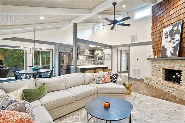 Inside, the home features clean architectural lines, large windows, abundant natural light, and a cozy fireplace that anchors the open living space. The open-concept layout flows seamlessly to a large covered back deck, perfect for relaxing, entertaining, or enjoying peaceful sunset views.