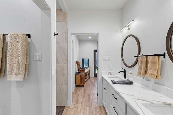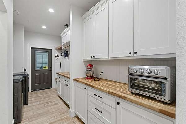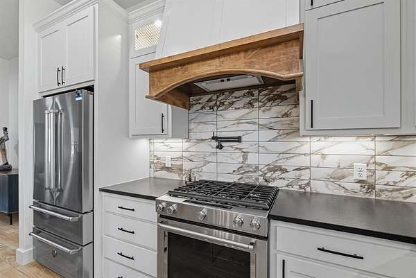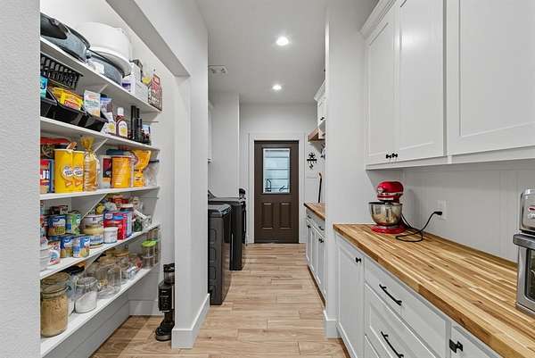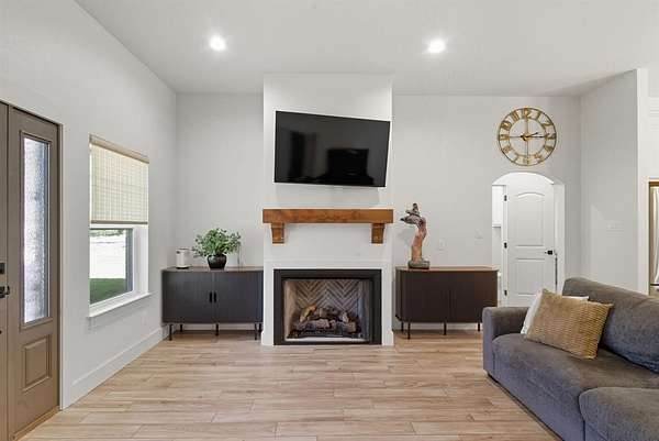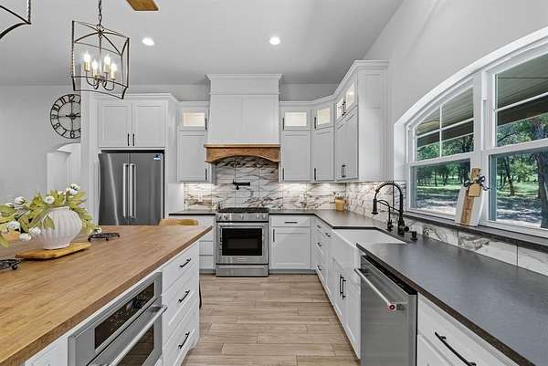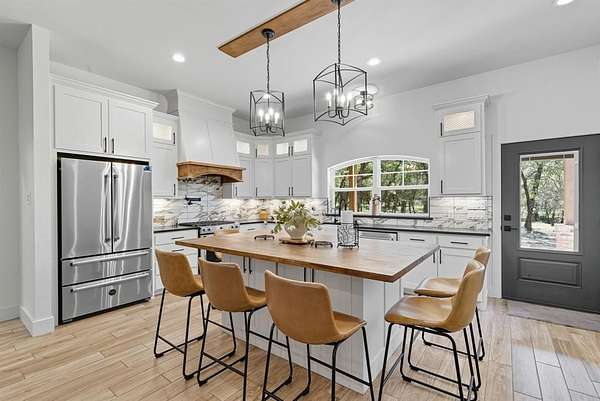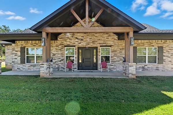 Brand-new and beautifully crafted, this home offers modern comfort, Texas charm, and nearly 3 acres of space in the sought-after Rolling Hills community of Alvord. Designed for both style and everyday ease, the open-concept floor plan showcases soaring 10 ft. ceilings, rich wood-look tile floors, and a welcoming living area with a stone fireplace and custom mantle. The kitchen is a true standout--leathered black granite counters, dramatic quartz backsplash, custom cabinets, butcher block island, gas cooktop, pot filler, and an oversized butler's pantry built for real cooking and effortless entertaining.