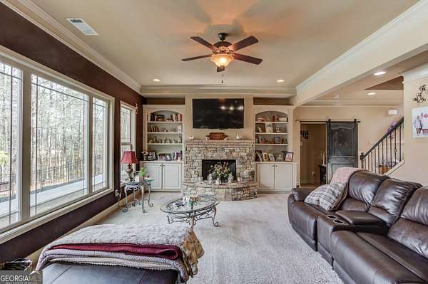 Welcome to this stunning, gated estate with 5.52 acres situated on a private lake in the highly sought after Jefferson City school district. From the moment you arrive, the charming wrap-around front porch invites you to relax and enjoy the serene surroundings. Inside, the main level offers an ideal layout for both everyday living and entertaining. A large gourmet kitchen serves as the heart of the home, complete with ample space for cooking and gathering, and is open to a fireside family room with stacked stone fireplace flanked by cabinets for storage and bookshelves. The spacious owner's suite is a true retreat, featuring a sitting area with fireplace, a spa-like bathroom with an oversized walk-in shower, dual vanities, and a generous walk-in closet. Upstairs there is a loft area, four bedrooms, including one with its own private bathroom, while two others share a well-appointed bath. A versatile media room provides the perfect space for movie nights, gaming, or relaxation. The rear yard is your own private oasis that features a covered rear patio with fireplace that overlooks an in-ground heated saltwater pool/spa and amazing views of a private, tranquil lake. At the lake you will find a covered dock with power that has plenty of seating area both covered and open. Additional features include a rip rap driveway that circles the property, multiple outbuildings, a firepit, pool storage room, 3-car garage and additional carport, a storm shelter, and dual water heaters.