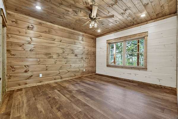 Experience refined mountain luxury in this exceptional 3 BEDROOM / 3 BATH TRUE LOG CABIN COMBINED WITH BOARD & BATTEN SIDING AND 4 ROCK GAS LOG FIREPLACES, SEASONAL RIVER VIEWS of the COOSAWATTEE RIVER, AND A CREEK RUNNING ALONG THE PROPERTY, where timeless craftsmanship meets serene natural beauty. Tucked inside a quiet gated community & on a spacious 1.52 acre lot, this home offers a peaceful setting w/ a paved driveway & detailed custom landscaping. Built by a respected local builder, it showcases signature craftsmanship, thoughtful design, & high-end finishes throughout. A welcoming covered porch leads into a foyer opening to a spacious living, dining, & kitchen area w/ circle-sawn hardwood floors & a blend of whitewashed & natural wood finishes throughout both levels. The living room features vaulted, beamed ceilings, a rock gas log fireplace, & a wall of windows capturing picturesque views & abundant natural light. The kitchen includes stainless appliances, granite counters, custom cabinetry, & a large island flowing into the dining area. The main level offers a guest bedroom, full bath, & a convenient primary suite w/ ensuite bath including a double vanity, oversized tiled shower w/ pebble flooring, & walk-in closet. Outdoor living shines w/ a full-length covered deck & fireplace to enjoy seasonal river views & the sounds of the Coosawattee River. The terrace level adds a second living area w/ fireplace, wet bar, bedroom, storage, & flex space ideal for a theater or gym, extending the high-end finishes from the main level, plus an additional oversized party deck w/ fireplace & hookups for a hot tub & generator. Community amenities include an indoor pool, river park, tennis courts, fitness center, & game room, all within 10 minutes of downtown Ellijay—this well-appointed home truly checks every box.