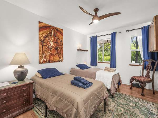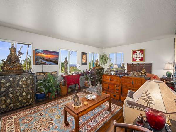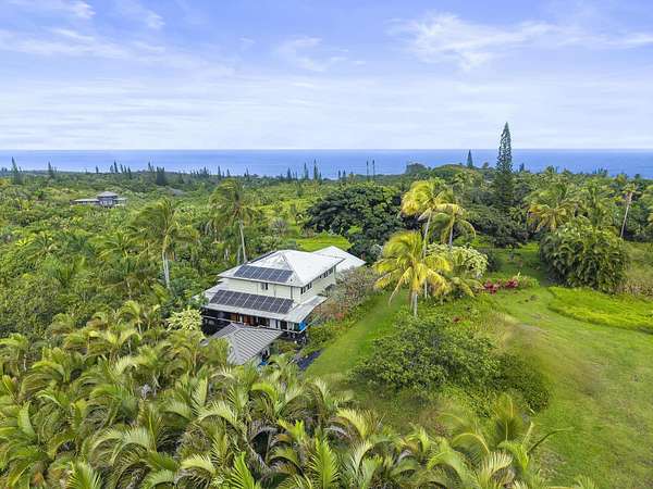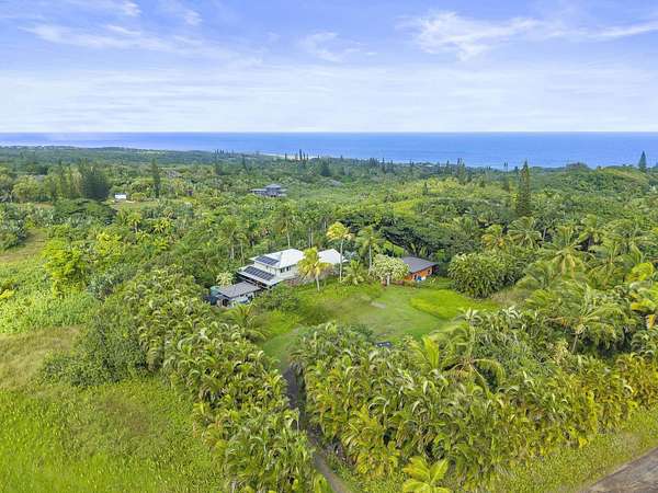 Serene estate set on 3.7 lush, tropical acres with sweeping ocean views, located just past Twin Falls in one of Maui's most established off-grid communities. This peaceful and private property offers a retreat-like atmosphere, featuring an extensive collection of mature palms, a perennial stream, and gentle ponds that invite reflection and creative expression. Meandering paths encourage slow walks and quiet moments of connection with the land, with endless potential for expanded tropical gardens. The property invites you to grow your own food and live a self-sustaining lifestyle. At night, it feels as though you could reach out and touch the stars. Nestled within the grounds is a tranquil meditation temple designed to calm the heart and center the mind, along with a thoughtfully curated meditation garden adorned with beautiful sculptures that add an artistic, soulful presence to the landscape. The land feels intentional, grounded, and naturally inspiring--ideal for those drawn to mindful, creative living. The two-story residence features 5 bedrooms and 6.5 baths, complemented by a dedicated library and an additional computer room--well-suited for study, remote work, or creative pursuits. An expansive covered deck capturing panoramic ocean and garden views. An opportunity for those seeking privacy, tranquility. Seller financing is offered.