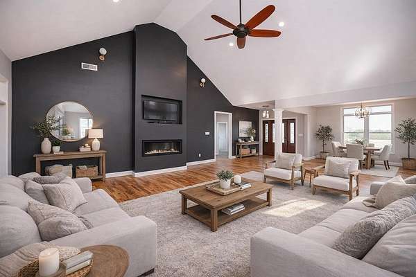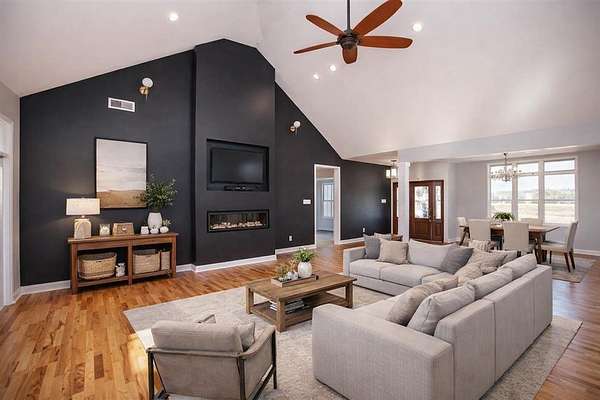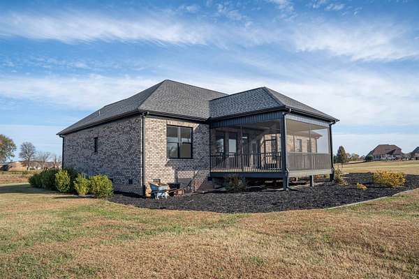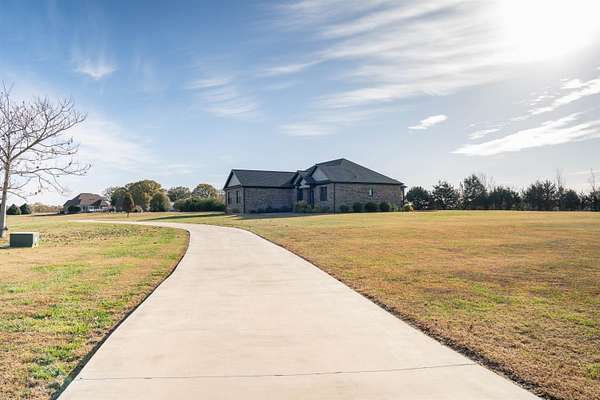 Experience the perfect blend of style, space, and convenience in this stunning one-level, brick home set on almost 4 acres of open, usable land. Built just 3 years ago, this property offers the feel of new construction with the benefit of established craftsmanship and thoughtful design. Step inside and be greeted by gorgeous red oak hardwood floors that flow seamlessly throughout the main living areas, adding warmth and elegance to every room. The expansive great room features soaring ceilings, a sleek accent wall, a modern built-in electric fireplace, and abundant natural light pouring in from the wall of windows overlooking the backyard. The open-concept layout transitions into a beautifully designed kitchen complete with dark custom cabinetry, granite countertops, stainless steel appliances, and a large island perfect for entertaining. The adjacent dining area provides even more room to gather and enjoy the views. This home offers 3 spacious bedrooms and 2 full bathrooms, including a serene owner's suite with a trey ceiling, large windows, and an ensuite bathroom featuring dual vanities, a walk-in tile shower, and direct access to a generous walk-in closet. Enjoy peaceful mornings and relaxing evenings on the screened-in back porch, overlooking your expansive acreage--ideal for gardening, recreation, or simply soaking in the privacy and tranquility. With a long concrete driveway, attractive brick exterior, and thoughtfully landscaped surroundings, this property is sure to wow with curb appeal and comfort from the moment you arrive. If you're looking for modern single-level living, acreage, and a move-in-ready home with high-end finishes, this is the one you've been waiting for.