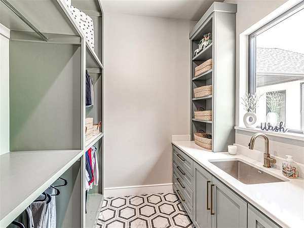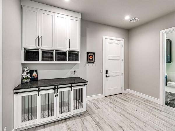 The mudroom makes a statement with its custom mud bench and a built-in pet station designed for your four-legged family members. Nearby, the oversized laundry room offers generous hanging space and storage, blending practicality with style.