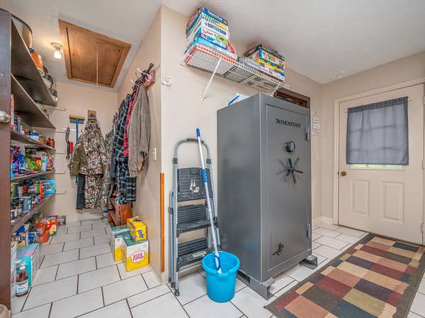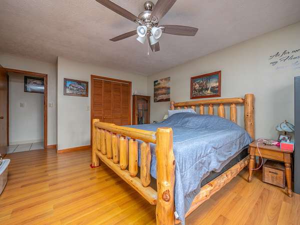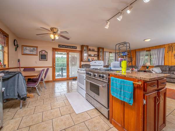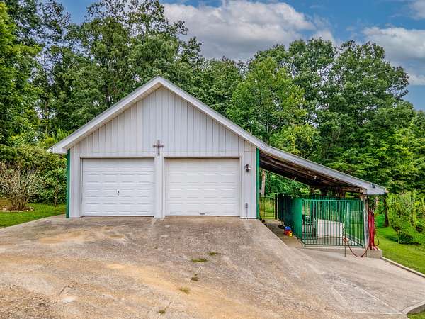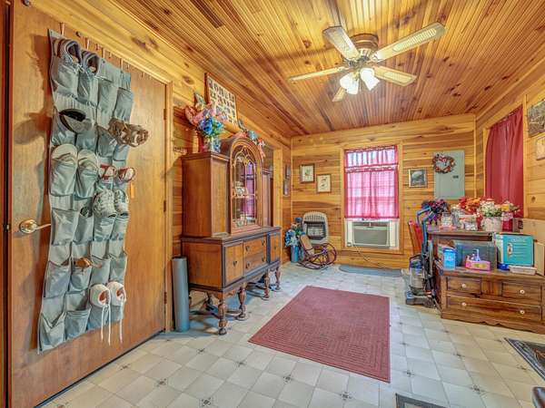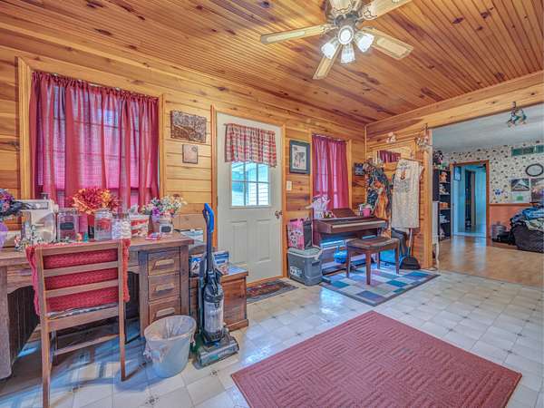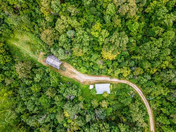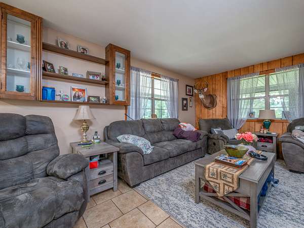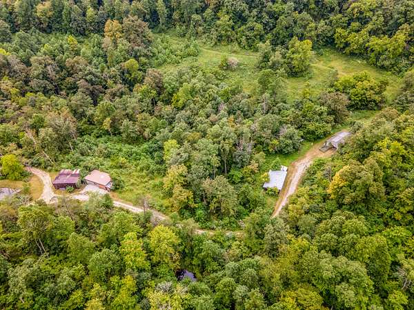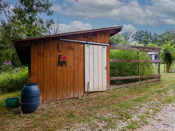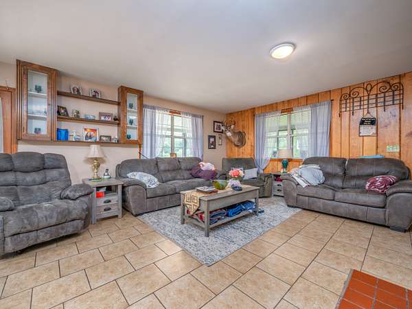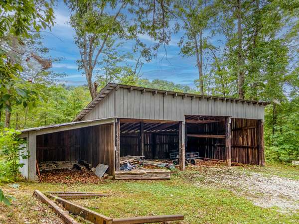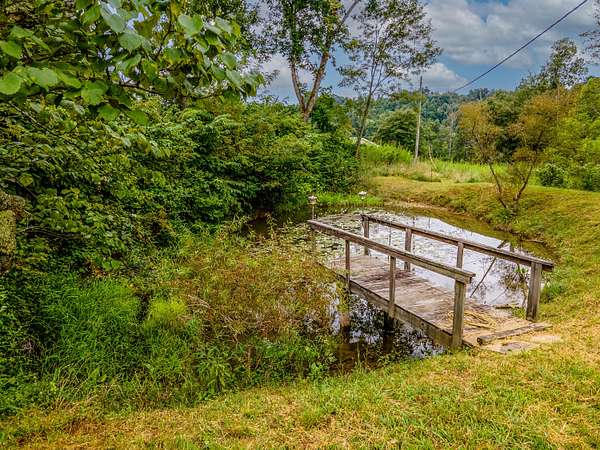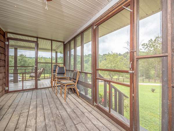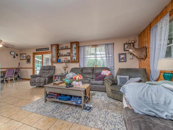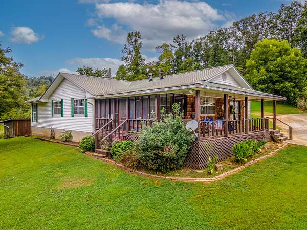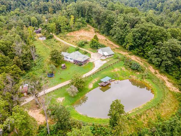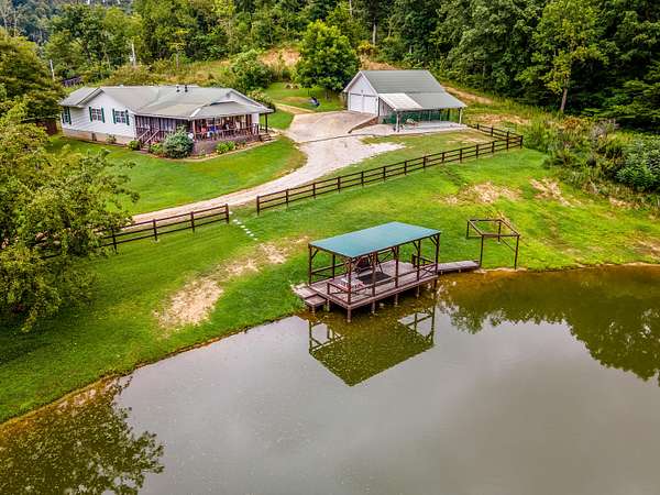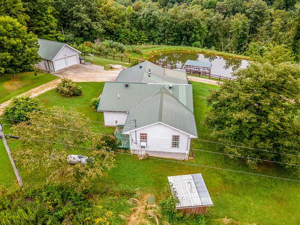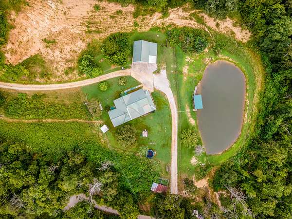 Enjoy country living on 112 acres with a home designed for both comfort and function and multiple outbuildings ready for use. A welcoming front porch with swing creates a perfect sitting area, while a screened side porch offers bug-free evenings. A side entrance leads directly into the utility room, which doubles as a mudroom and includes laundry, a full bath with stand-up shower, and a spacious pantry for storage. Inside, the home features an open layout great room that includes the kitchen, dining and living area. A large pond with a wooden dock sits in front of the house, reaching up to 15 feet deep for fishing or swimming, and a second smaller pond lies near the outbuildings. Improvements include a two-car metal garage with kennels and water spigot, barns, sheds, a workshop, chicken house with fencing, and equipment storage. The property is on a cistern, though public water lines and meter are already in place, and ductwork is installed for central heat and air.