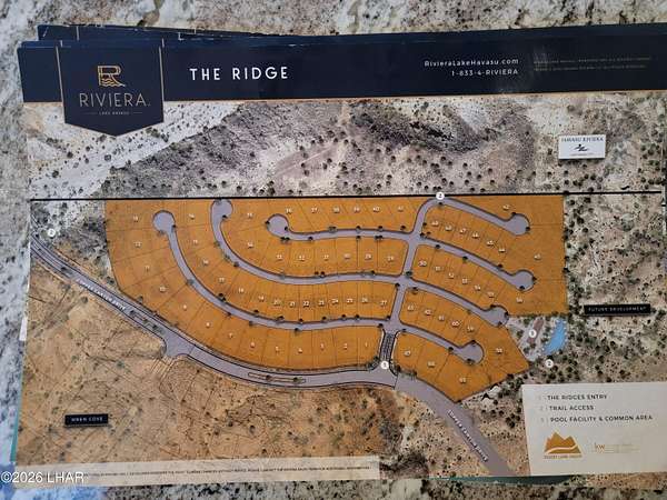 Est $2,649/moWelcome to Lake Havasu Cities newest Gated Development -The Riviera. This Lot is on the top row of the Ridge Neighborhood graded for a Large RV garage and a build height up to 40 foot. Panoramic Lake and Mountain views and just steps away from the new Riviera Marina that has a launch ramp/ general store boat slips and its own beach. The Development has underground utilities and future community pool . Beautiful Havasu sunsets will be seen over the lake from rear of property. Pick your builder and design your dream home in Paradise.