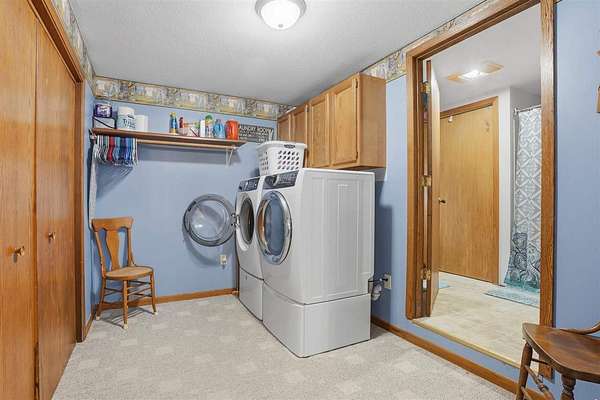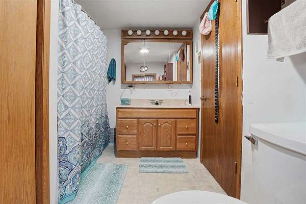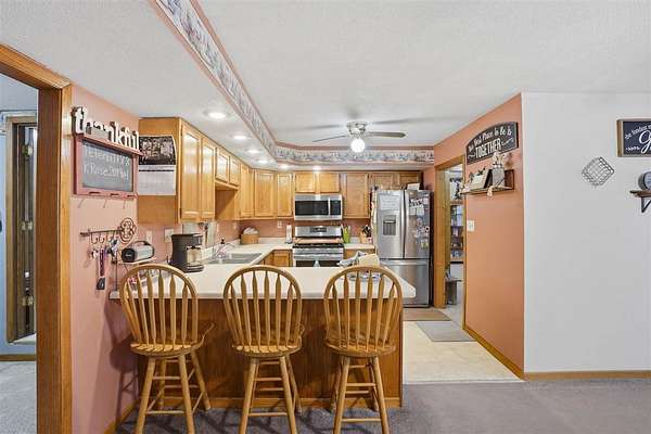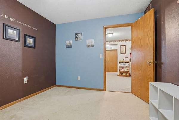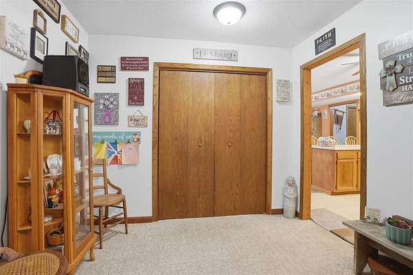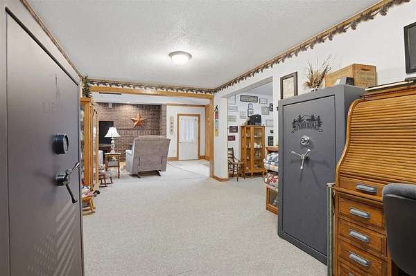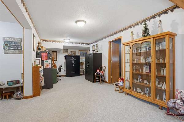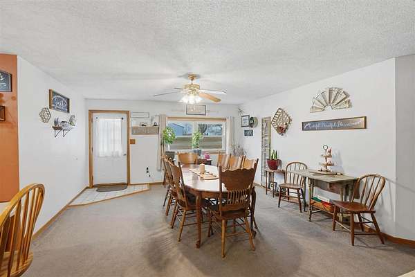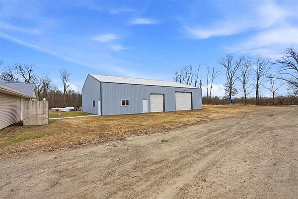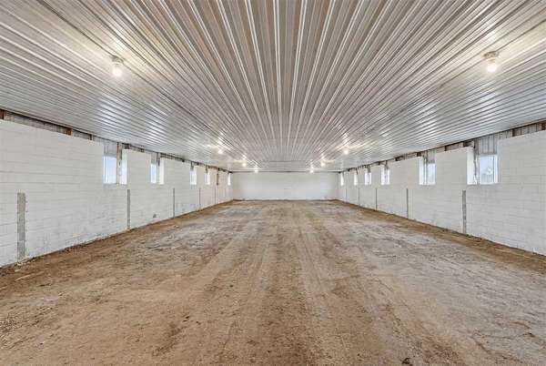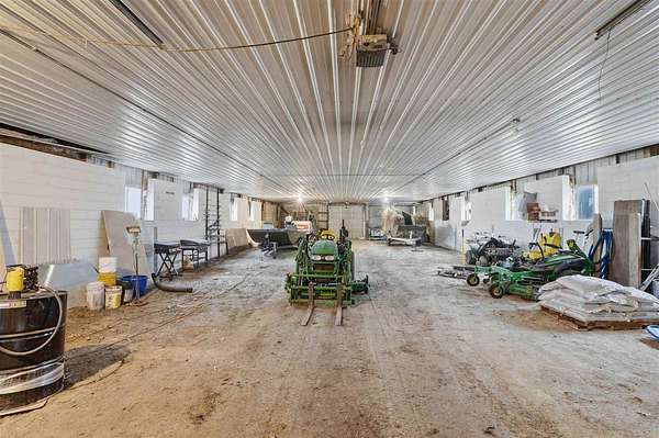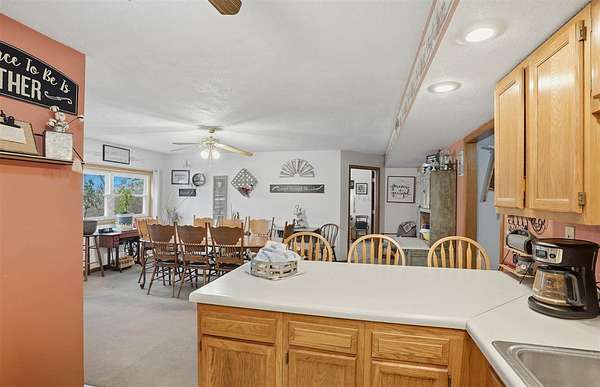 Well-maintained 5-acre acreage featuring a comfortable ranch-style home with spacious main-level living and excellent outbuilding options. The home offers a large family room with vaulted ceiling, wood-accent walls, and a brick hearth with pellet stove, creating a warm and inviting gathering space. An open dining area provides ample room for hosting, flowing into the kitchen with solid wood cabinetry, center island with seating, and generous counter space. The main level includes multiple bedrooms with good closet space and neutral finishes. The layout offers flexibility for family living, home office needs, or hobby space, with plenty of storage areas integrated throughout the home. Two large outbuildings enhance the property's versatility. One building measures 44 x 72, ideal for equipment or storage. The second building measures 40 x 98 and includes a heated shop area while still offering significant cold storage. The setting offers privacy, open yard space or pasture, and surrounded by mature trees making this a well-rounded acreage with practical improvements already in place--ideal for those seeking space, functionality, and a rural lifestyle within easy driving distance of town.