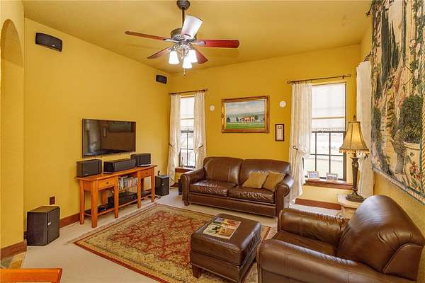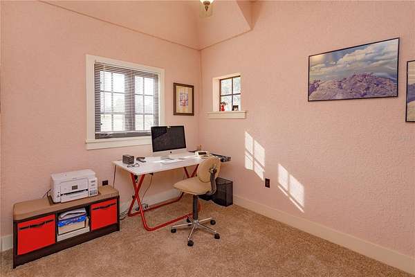 - Built-In Features, Ceiling Fans(s), Eat-In Kitchen, High Ceilings, Primary Bedroom Main Floor, Solid Wood Cabinets, Split Bedroom, Stone Counters, Thermostat, Vaulted Ceiling(s), Walk-In Closet(s), Window Treatments