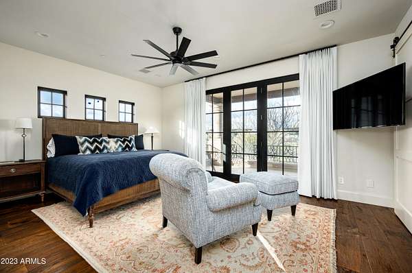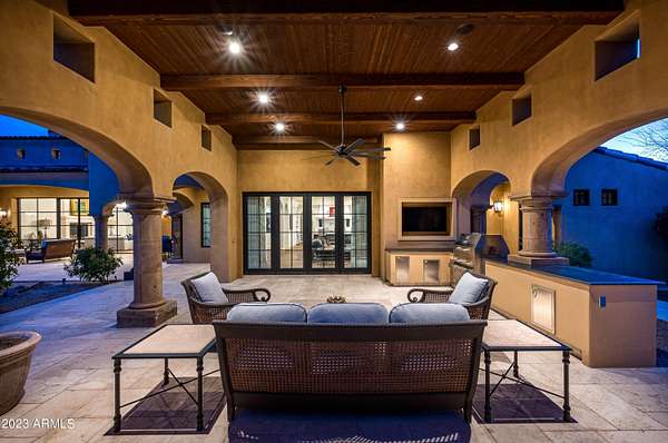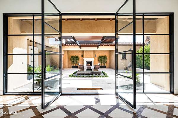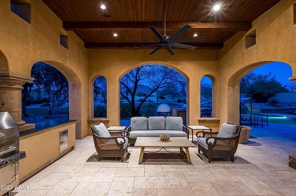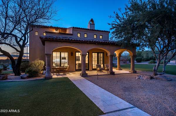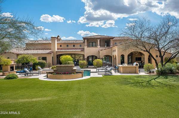 The best of Prado Estates. Elegantly crafted and styled this Modern Spanish estate has been completely renovated by Mike Graham of American First Builders, exemplifying all that is modern and sophisticated. Featuring large functional living spaces opening to sweeping mountain and city views on this rare, large 4.7-acre estate lot. Upon entering, a large private courtyard leads to a stunning entry with custom steel windows and doors throughout capturing views of Pinnacle Peak and distant mountain vistas. Enjoy the open floor plan featuring a gourmet kitchen with double islands, a fully equipped butler's pantry and a welcoming great room with beamed ceiling detail and custom built ins. The Primary suite and office are located in a private area of the home while the en suite guest rooms are all spacious with private bathrooms featuring customized detailed tile work throughout. The massive 6 car garage, workshop and auto court make this home perfect for a collector or large family. A large two-story guesthouse includes two bedrooms and a private living area. Expansive resort like grounds featuring a private sport court/tennis court, putting green, custom outdoor kitchen with BBQ and pizza oven, heated pool and spa with room to add countless amenities. All located at the end of a quiet and private gated street. Prado Estates is convenient to multiple golf courses, hiking, shopping and restaurants in North Scottsdale. Truly the best of Arizona living!