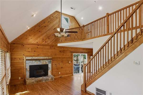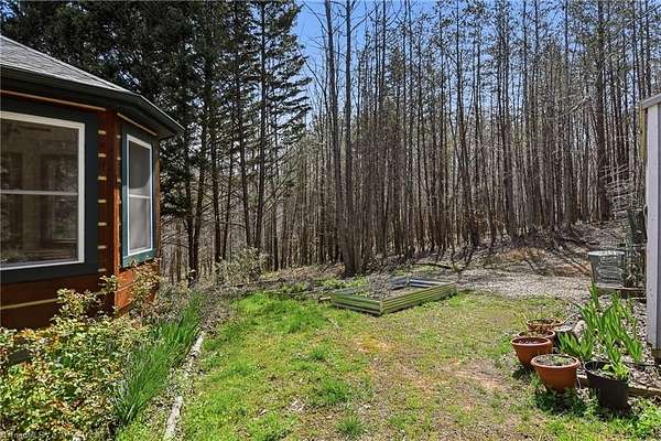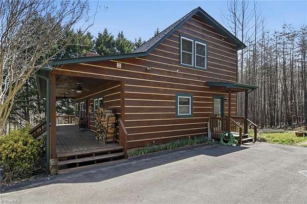 Lots of quiet privacy on this beautiful wooded 2 acres. Lovely log home with upstairs spacious owners suite and office loft area. Open floorplan on the first level includes the living room with a vaulted ceiling and cozy wood burning stove, kitchen island, sunroom, 2nd bedroom and 1.5 bathrooms. Home includes 2 outside storage units, one for equipment and one wood shed. New roof 2026. Garden beds are ready for spring planting. Don't miss the opportunity to make this quiet oasis your own.