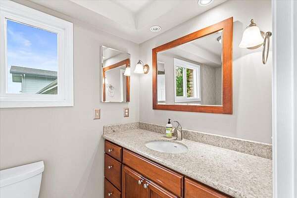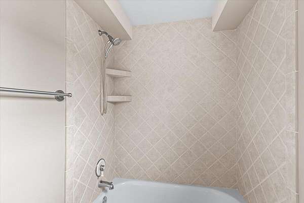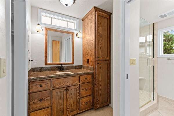 - Ceiling Fan(s), Fiberglass Stall Shower, Granite Counters, Linen Closet, Primary Downstairs, Shower/Tub Combo, Tile Shower, Vaulted Ceiling(s), Walk-In Closet(s)