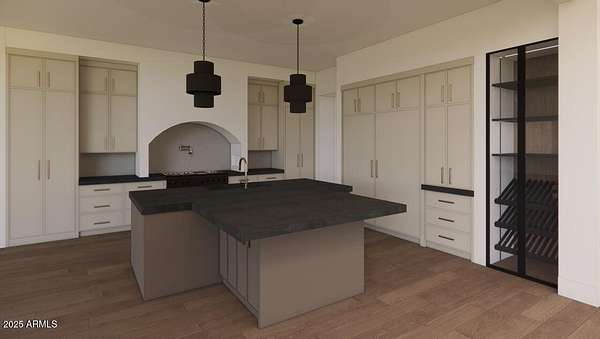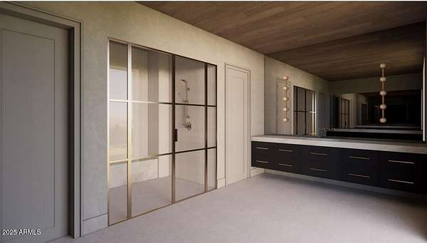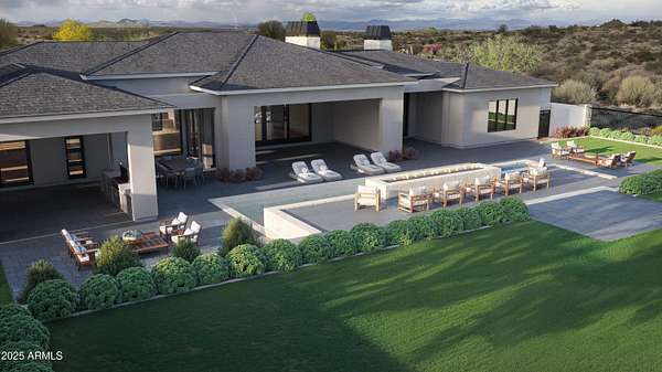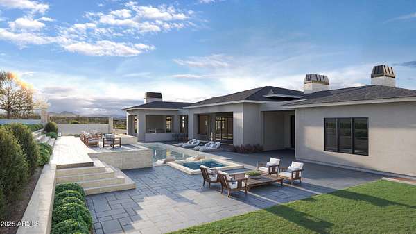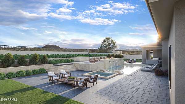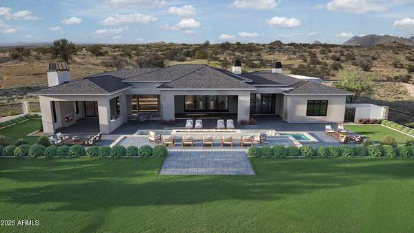 Experience this TO-BE-BUILT 5,600 sq ft custom contemporary home designed by Encore Design Group, ideally situated on a private 3-acre, no-HOA lot just moments from Tom's Thumb Trailhead in North Scottsdale's breathtaking high desert. Showcased in the architectural rendering, the exterior blends warm stone, modern rooflines, and a dramatic gated courtyard entry that sets the tone for the refined design throughout. Inside, the home is anchored by an expansive great room featuring soaring ceilings, walls of glass, and seamless indoor-outdoor connectivity overlooking the natural desert landscape. The split floor plan offers a luxurious master wing with a spa-inspired bathroom and an oversized custom closet. The secondary layout includes three private ensuite bedrooms, a dedicated guest suite, and a professional home office positioned off the front courtyard. A spacious media/game room provides the perfect retreat for entertainment or family use. At the heart of the home, the chef's kitchen features a large island, designer finishes, a walk-in pantry, and a full prep kitchen, all flowing naturally into the dining area and outdoor living spaces. A convenient pool bath supports future resort-style outdoor amenities. For car enthusiasts or those needing substantial storage, the property includes two oversized side-entry garages, offering generous space for vehicles, equipment, or workshop use. Surrounded by untouched Sonoran Desert with no HOA restrictions, this residence blends contemporary architecture, luxury finishes, and serene privacy in one of Scottsdale's most desirable natural settings.