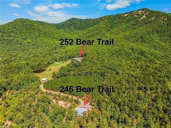 Experience 56 breathtaking acres of pure mountain beauty complete w/ panoramic long-range views, a peaceful spring-fed pond, & space to bring nearly any vision to life. This exceptional property includes 2 extraordinary homes along w/ impressive outbuildings, offering unmatched versatility for personal, recreational, or business use. The primary residence spans over 7,000 sq.ft. & features 3 bdrms on main lvl, 3.5 ba, & a fully finished basement with kitchen, bedroom and bath. The 2nd home, a modern 2-bdrm 2-bath chalet built in 2024, showcases a seamless connection b/w indoor & outdoor spaces perfect for guests, extended family, or short-term rental potential. Additional property features: 30x50 metal building w/ a heated/cooled 20x30 workshop ideal for hobbies, storage, or business operations & a 20x20 studio equipped w/ a wood stove. Whether you're envisioning a private mountain estate, multigenerational compound, or live/work sanctuary, this property delivers endless opportunities.Convieniently located 15 minutes to Mt. Airy, NC; 45 minutes to Winston Salem, NC; 1.5 hours to Charlotte, NC; 20 minutes to Galax, VA. Property Data is for 252 Bear Trail Only. See attachments for 246 Bear Trail Info.