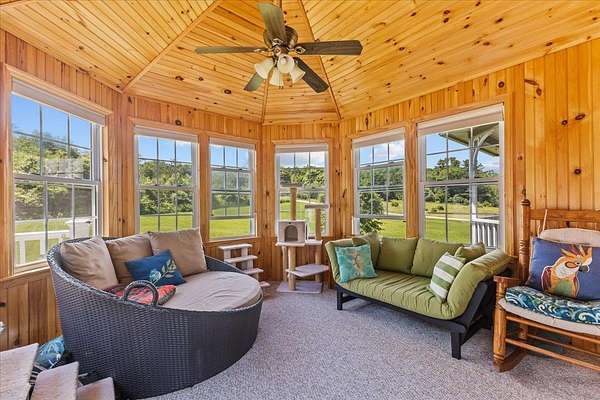 Discover the perfect blend of country charm and modern comfort with this stunning 4-bedroom, 2.5-bath home set on over 17 picturesque acres. Whether you're seeking privacy, space to roam, or room for extended family, this property delivers it all. Inside, the spacious eat-in kitchen features a breakfast bar and cozy dining nook, opening to a formal dining room that's ideal for gatherings. The large living room offers warmth and character with its stove and expansive layout, while a wood-paneled sunroom provides the perfect spot to relax and take in peaceful views year-round. The first floor is completed with a mudroom and half bath. Upstairs you will find three bedrooms and a full bath. Each bedroom is generously sized, and recent updated flooring adds a fresh, modern touch throughout. The home also includes a private in-law apartment with its own bedroom and living area, laundry and heated floor--perfect for guests or multi-generational living. Outside, enjoy your own retreat with a stone patio featuring a hot tub, a wrap-around covered porch ideal for morning coffee or sunset views, and a large detached two-car garage offering ample storage or workshop space. With over 17 acres to explore, this property provides endless opportunities for outdoor recreation, gardening, or simply enjoying the beauty of nature.