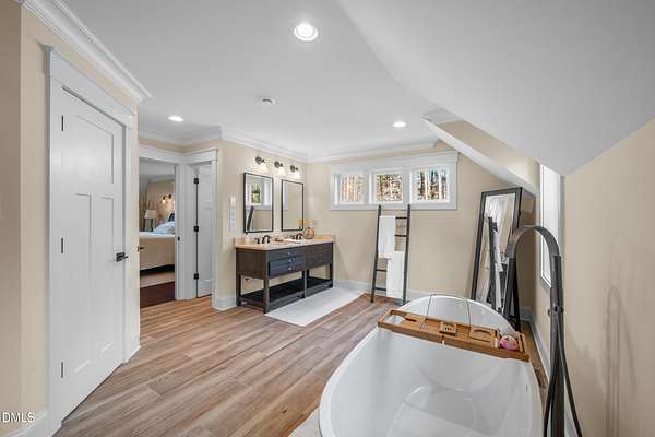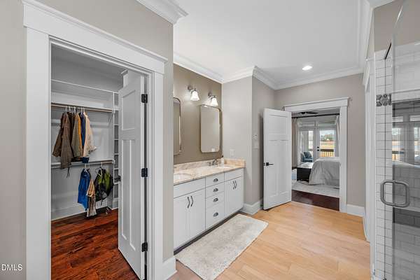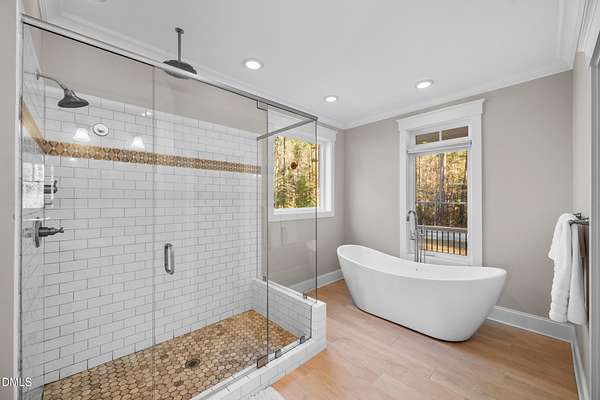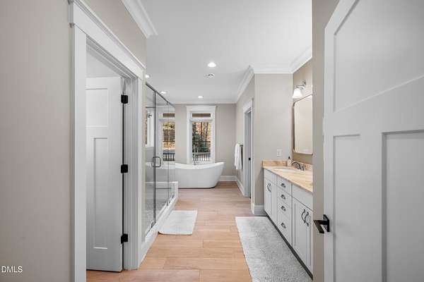 - Bookcases, Ceiling Fan(s), Crown Molding, Double Vanity, Eat-In Kitchen, High Ceilings, Kitchen Island, Pantry, Primary Downstairs, Quartz Counters, Smart Thermostat, Smooth Ceilings, Soaking Tub, Walk-In Closet(s), Walk-In Shower