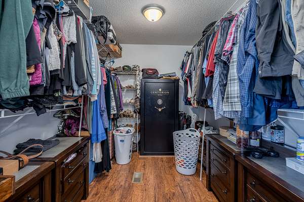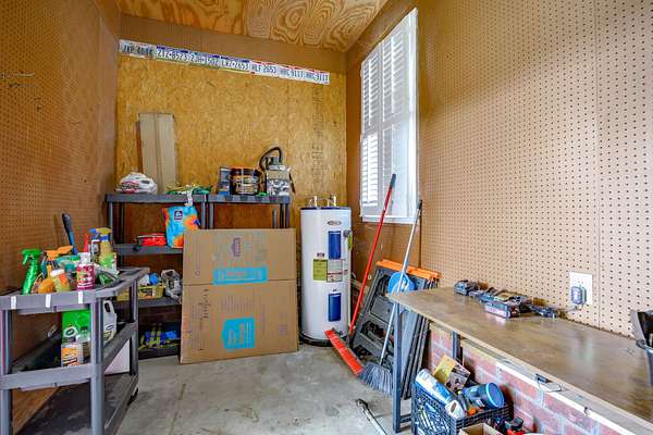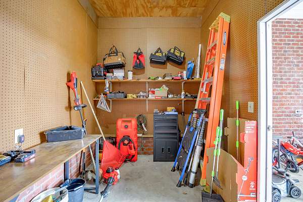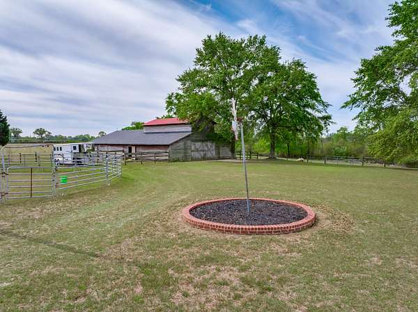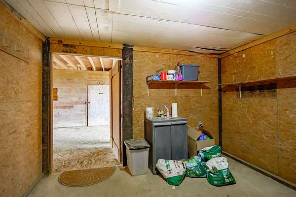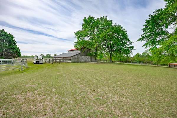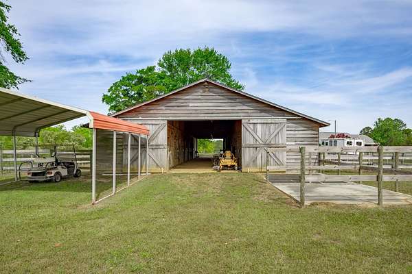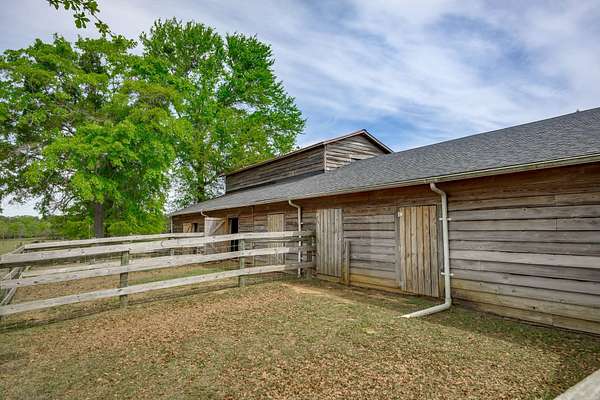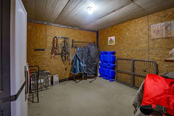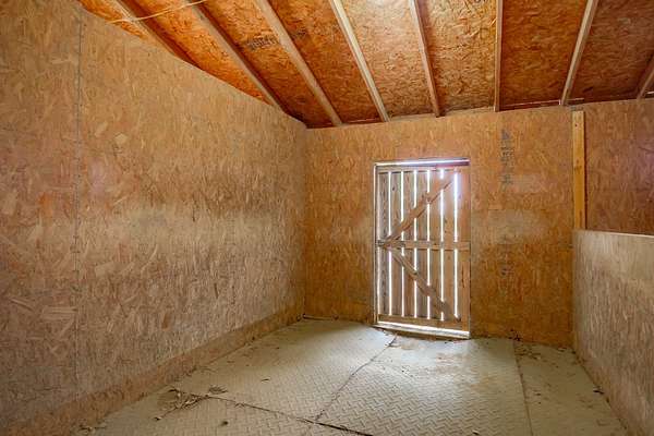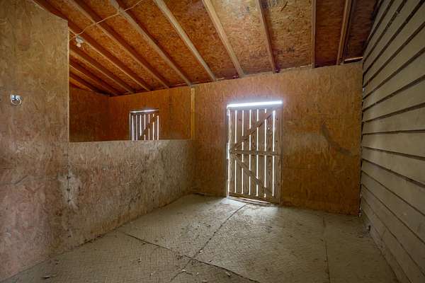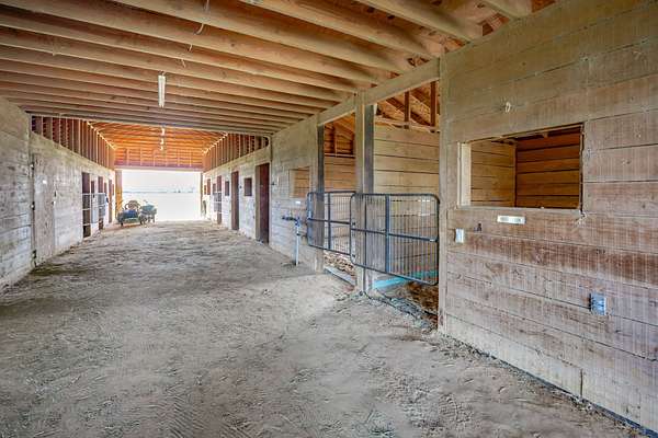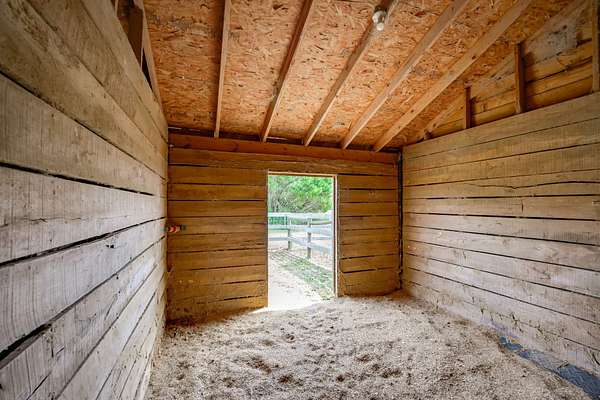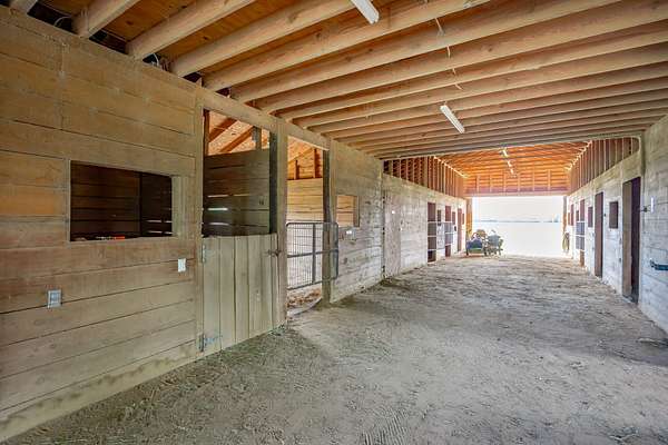 The 10-stall barn has a center aisle with stalls on both sides. Each stall has a door to the aisle and a door that opens to the paddock. Inside the barn, there are two tack rooms and a storage room. There's also a loft for extra storage that runs about one-third the length of the barn. The barn has lights and water, plus a wash rack outside.