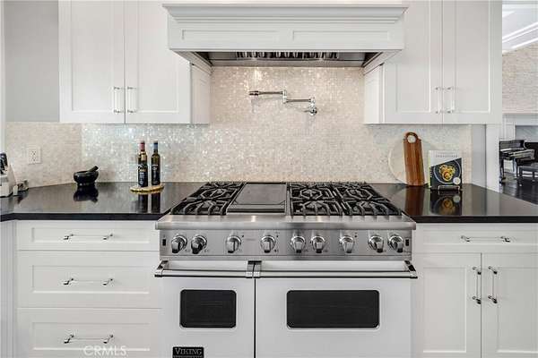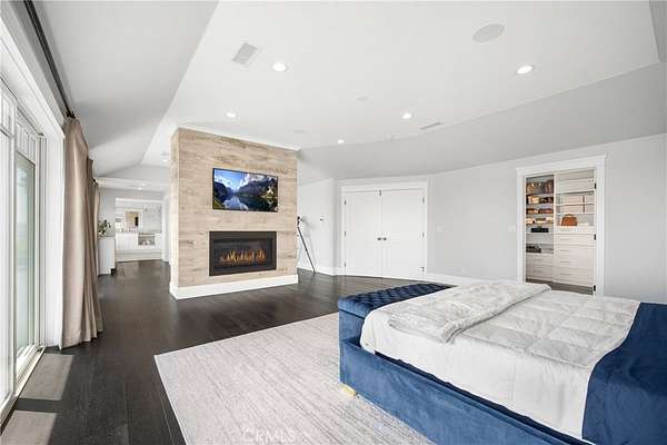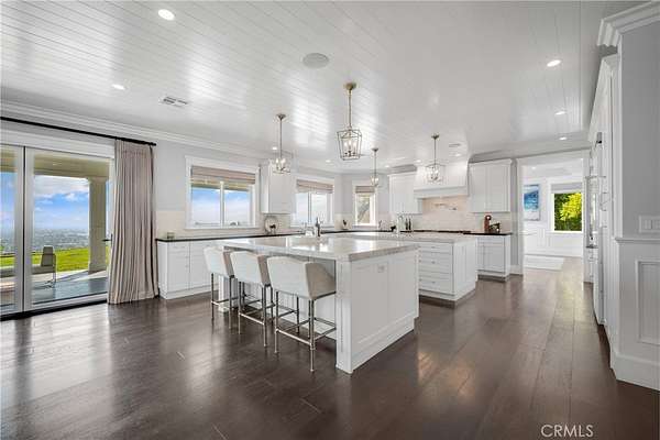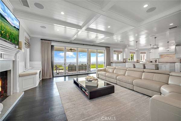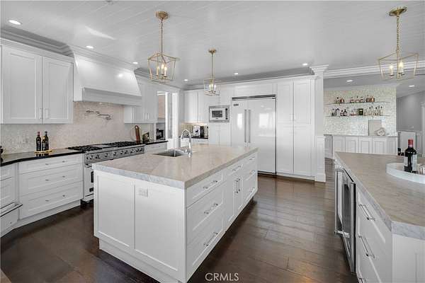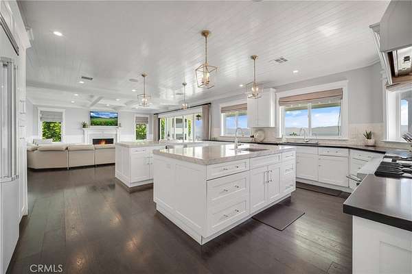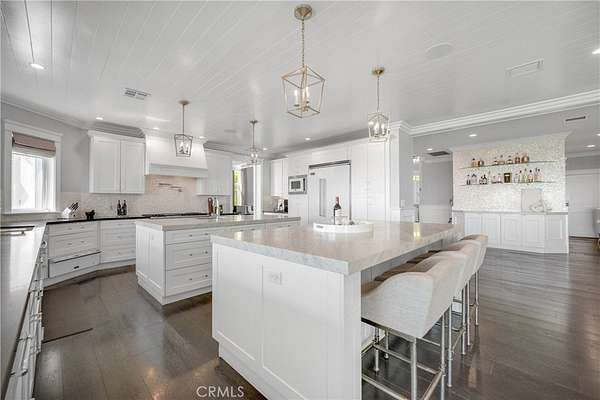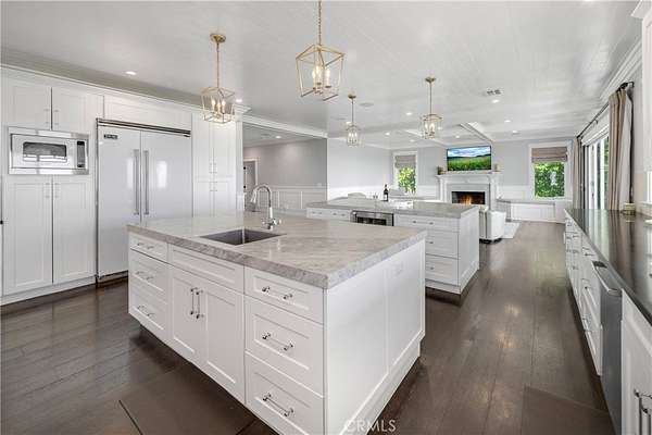 The designer kitchen is a chef's dream with two expansive Carrera marble islands providing seating and storage, top-of-the-line Viking appliances including a six-burner dual oven with griddle, pot filler, warming drawer, built-in refrigerator, dishwasher, beverage fridge, and abundant cabinetry. The open-concept design flows seamlessly into the family room, complete with a fireplace, window seats with hidden storage, and bi-fold doors with a built-in screen for effortless indoor-outdoor living.