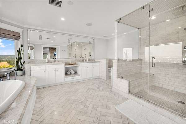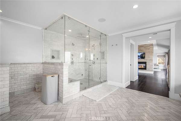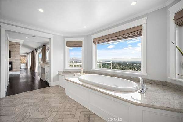 The master retreat offers a sitting room with a double-sided fireplace, a large balcony to capture the scenery, dual walk-in closets, and a spa-like bath with double vanities, an oversized steam shower, and a soaking tub positioned to overlook the view. Upstairs also includes two guest suites with en suite baths and a laundry room with sink and ample storage.