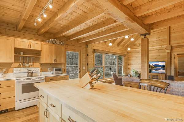 Inside, the home showcases beautiful custom reclaimed wood flooring and warm mountain character throughout. The spacious layout includes an open kitchen with a large island, creating a perfect space for cooking, gathering, and entertaining while enjoying the surrounding mountain scenery.