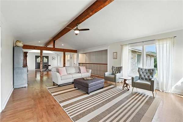 This incredible home blends architectural character with modern updates across a spacious layout full of thoughtful details. A stunning stone fireplace anchors the vaulted dining room with exposed beams and warm wood ceilings, creating a dramatic and inviting space. The updated kitchen features quartz countertops, a gas range, oversized island, and stylish pendant lighting, all open to the main living areas for seamless flow. The living room is a showstopper with a coffered ceiling, wood floors, and large windows that frame peaceful views. Multiple living and family rooms offer flexibility for everyday life and entertaining, with each space offering its own charm. The primary suite includes a large walk-in closet and luxurious bath with dual vanities and a walk-in tile shower. Additional bedrooms offer generous space with walk-in closets and ceiling fans.