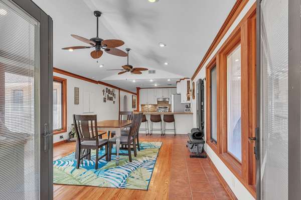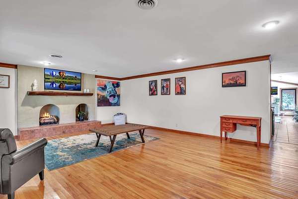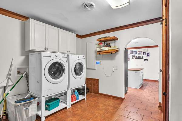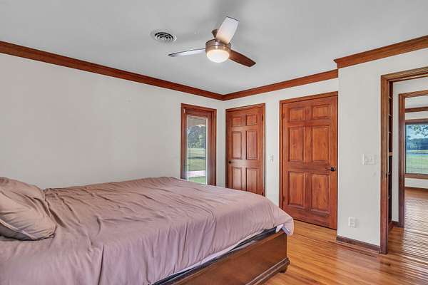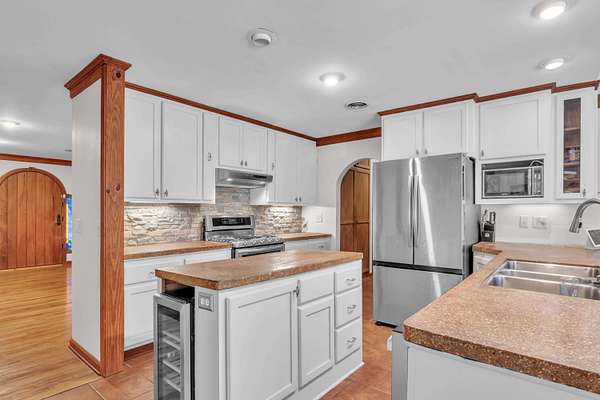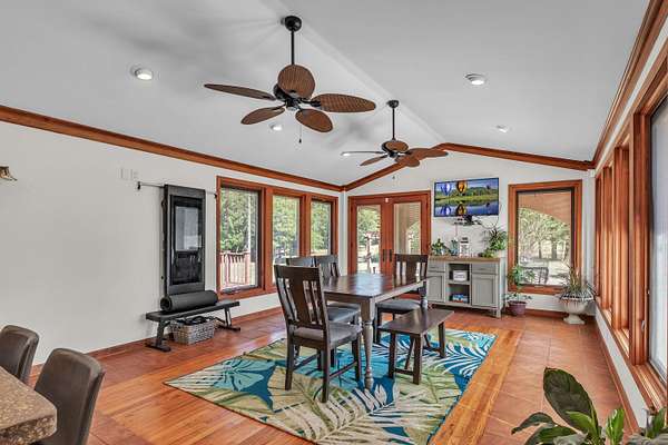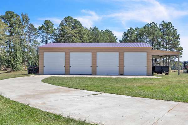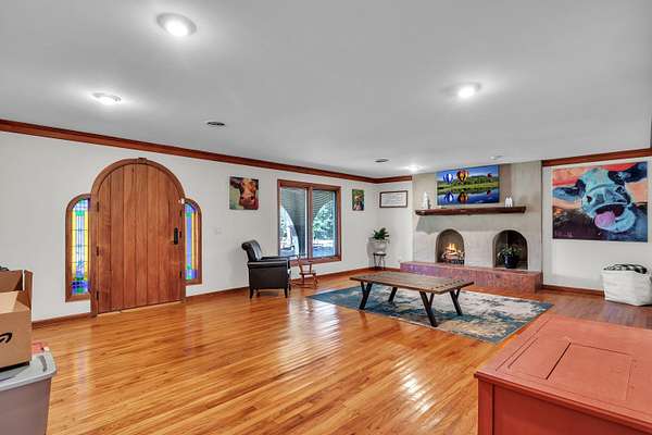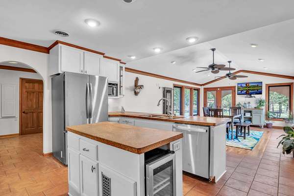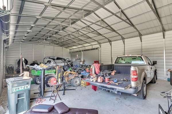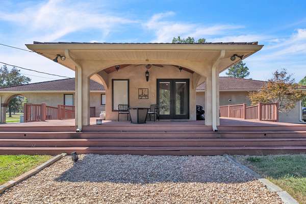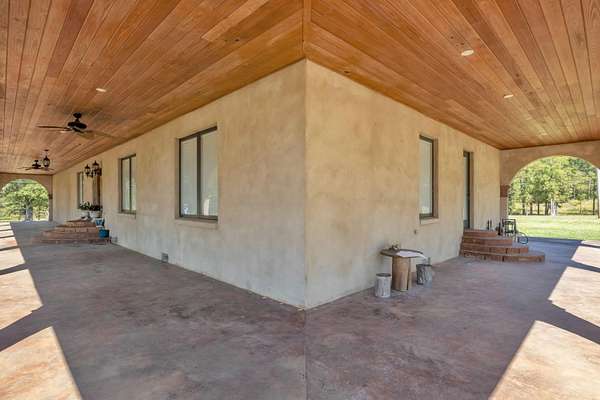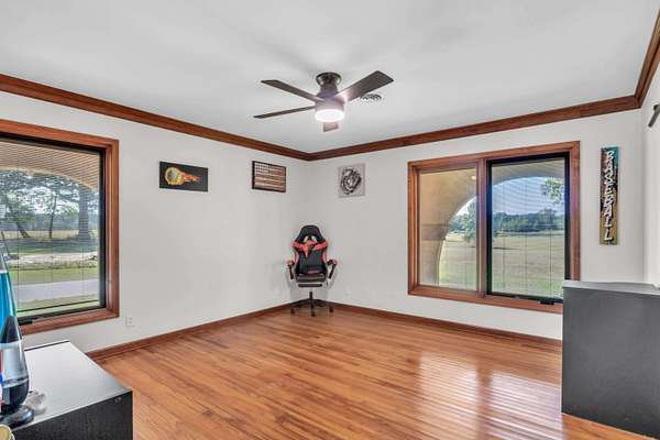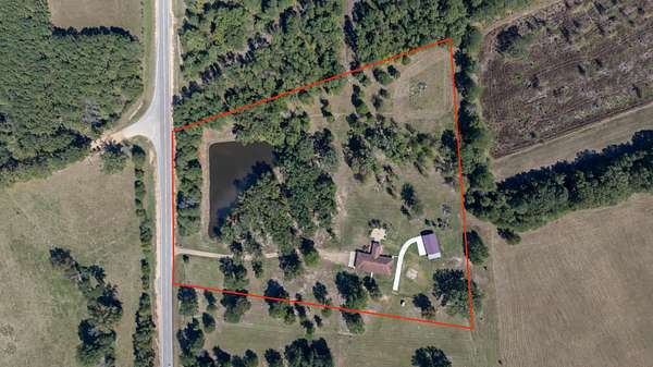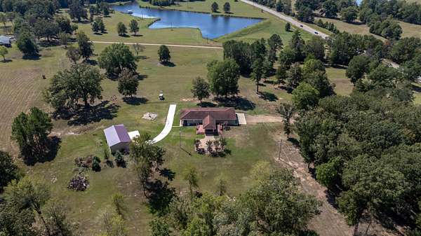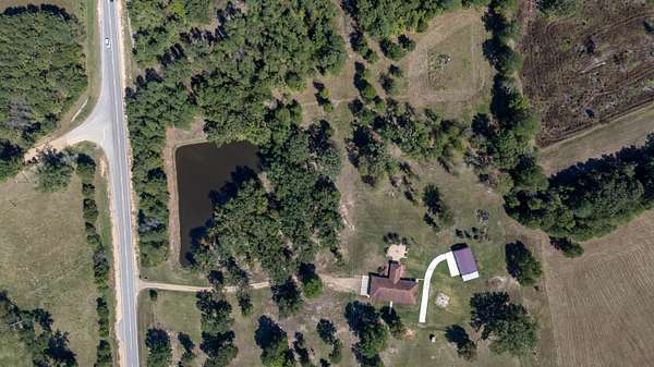 This must-see home offers 9.3 acres with custom features throughout. Inside, you'll find a light-filled dining room, kitchen with painted cabinets, concrete counters, and stainless appliances, plus a utility room with pantry storage, island, laundry, and half bath. Highlights include hardwood/tile floors, a custom arched walnut door with stained glass, and a spacious living room with gas fireplace and log mantel. Three bedrooms feature ample closets and floor-to-ceiling windows. Extras include a Spanish tile-style metal roof, Pella windows, composite decking, storm shelter, tankless water heater, Generac generator, 3-bay garage with sink/storage, and a new 4-bay shop with concrete floor. Located in Houston School District with a stocked pond.