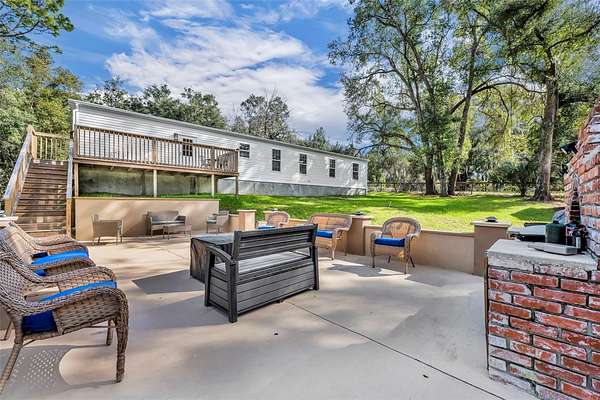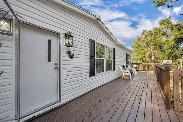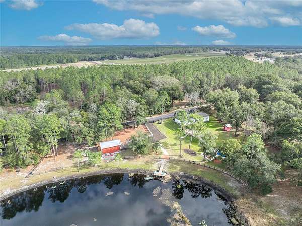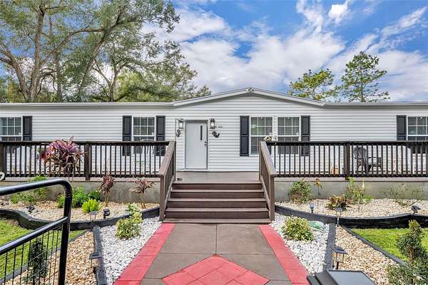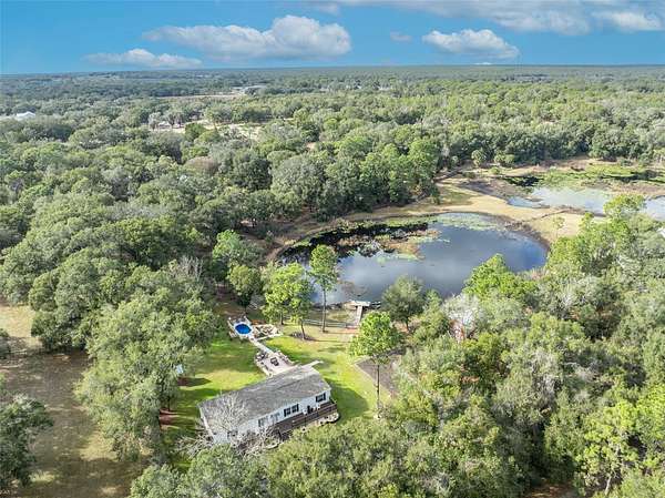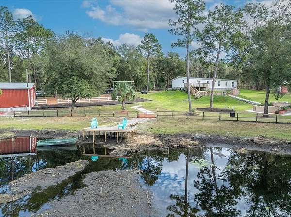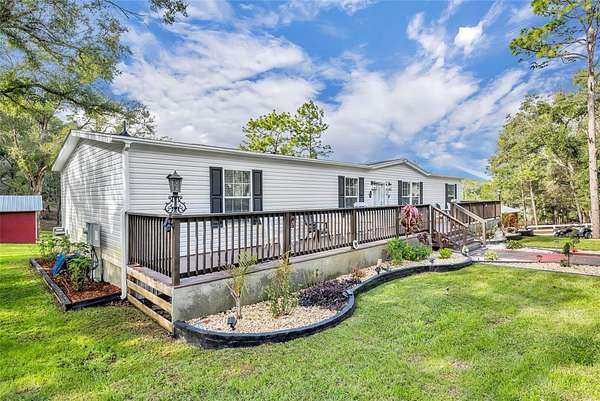 One-of-a-kind private estate LAKEFRONT living with modern comfort and endless outdoor amenities! Built in 2023, this stunning 4-bedroom, 2-bath Champion luxury POOL home sits on 2.33 ACRES and is perched atop a permanent concrete block foundation, offering both peace of mind and long-term durability. A breathtaking 70-foot covered front porch welcomes you home, while the 16-foot rear balcony overlooks your own private stocked lake with dock, creating a truly serene backdrop.
