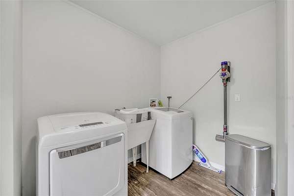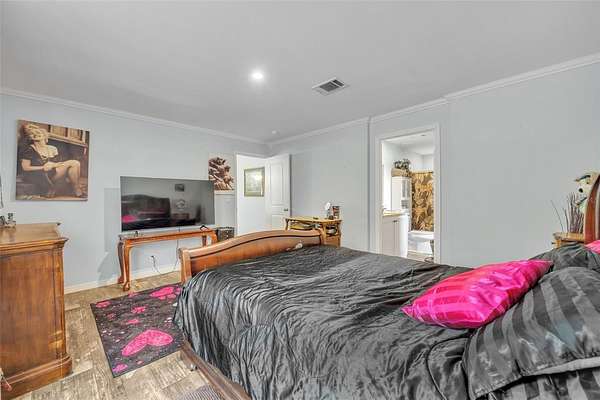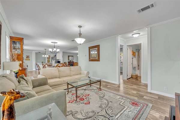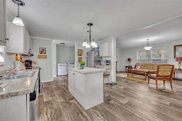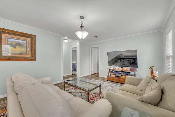 Inside the 1,816 sq ft open-concept layout, you'll find vinyl flooring throughout, crown molding, stainless steel appliances, a spacious kitchen island, updated lighting, and Levolor wood blinds in every room. The home features two large living areas, ideal for entertaining, multi-generational living, or simply spreading out and enjoying the space.