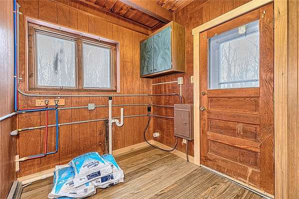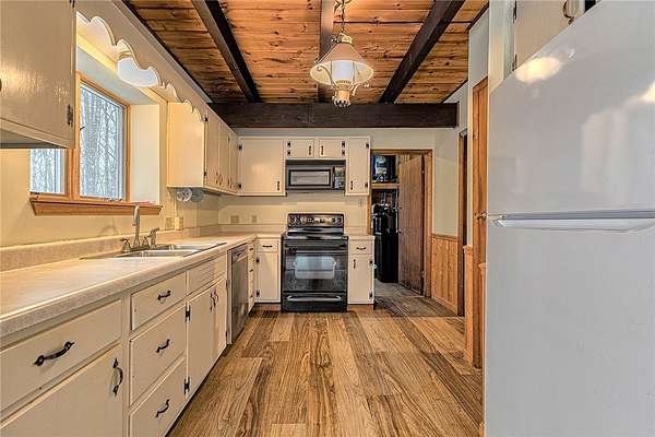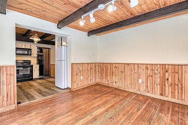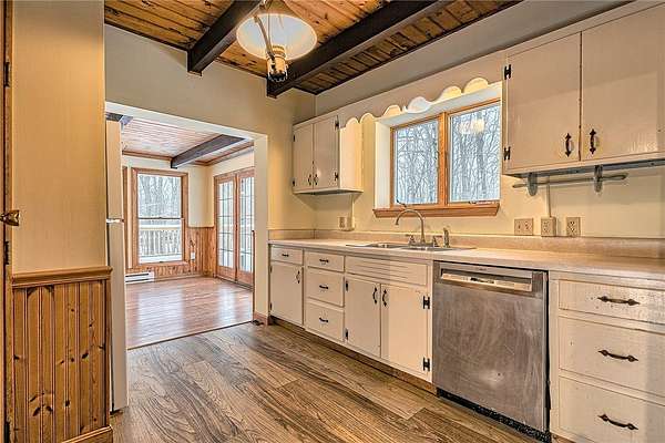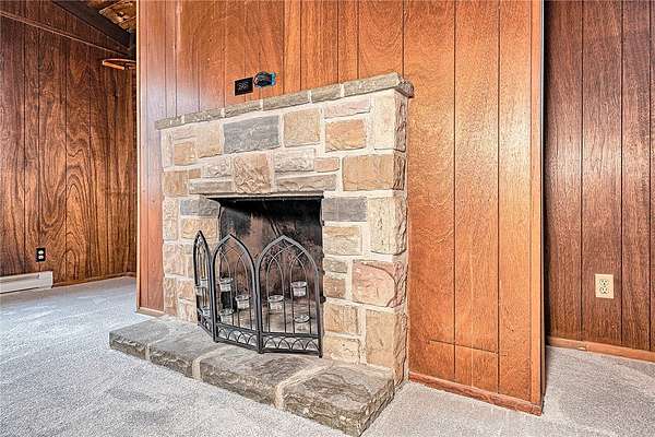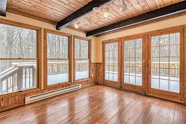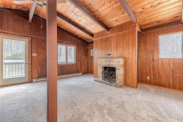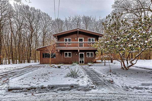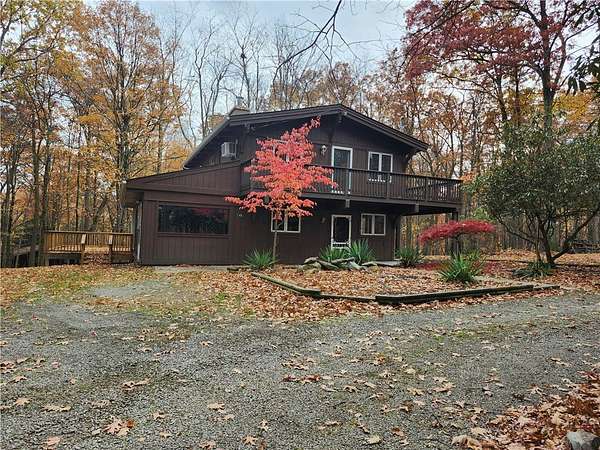 Nestled in the peaceful community of Bear Rocks, this charming home sits on just over 2 wooded acres & offers privacy, natural beauty, & an inviting rustic feel. Ideally located at the gateway to the beautiful Laurel Highlands, it places you just moments from an abundance of 4 season activities & scenic outdoor adventures. The Governors drive provides off street parking & leads you inside to a cozy living room with a wood burning stove. The kitchen, equipped with all appliances, connects to a convenient laundry/utility/mud room. The dining room impresses with hard wood floors, beamed ceiling, chair rail detailing, & a stunning wall of windows accented by a French door that opens to a spacious private deck, perfect for entertaining or simply enjoying nature. The main bedroom offers a true retreat with a wood burning fireplace, private deck, & spacious en suite. Whether you're seeking a peaceful retreat or active lifestyle, this home provides endless opportunities.