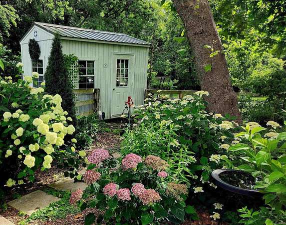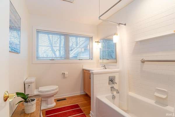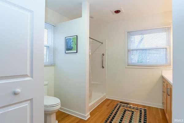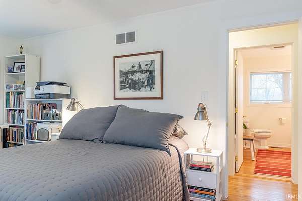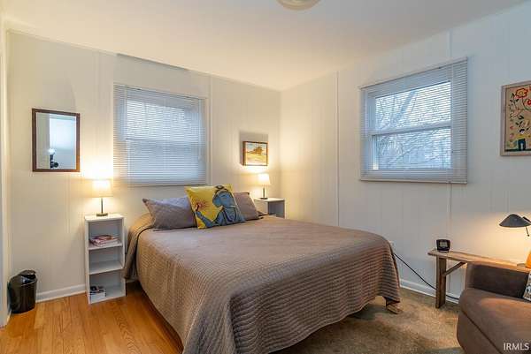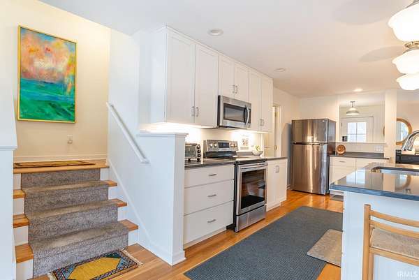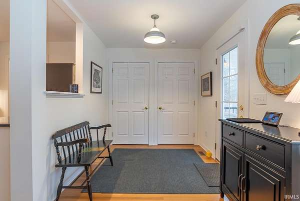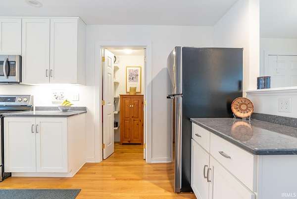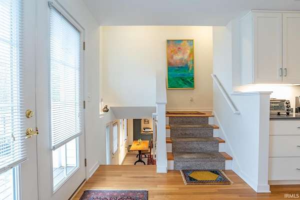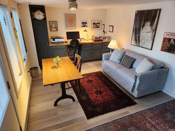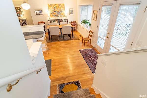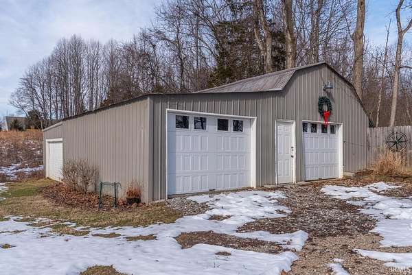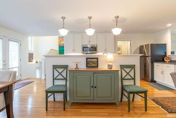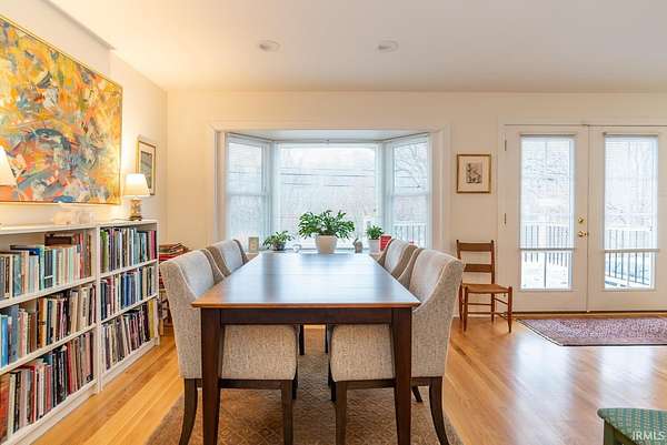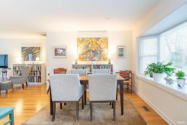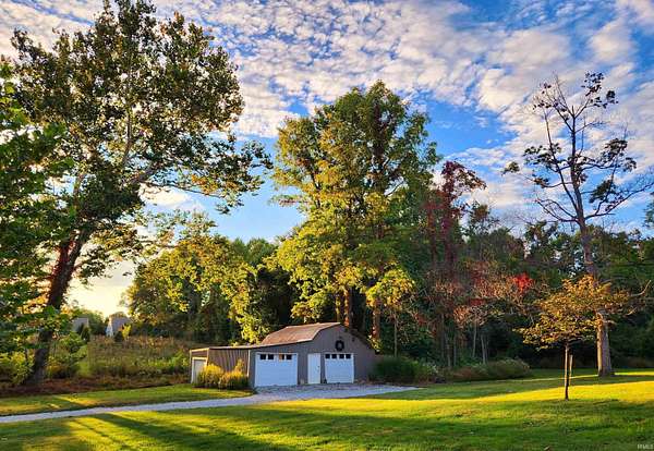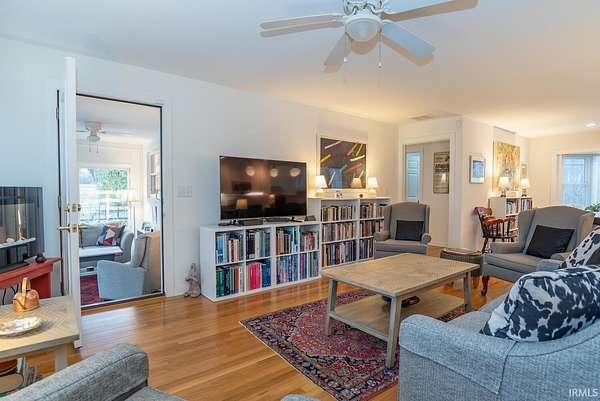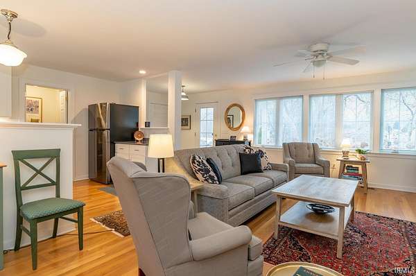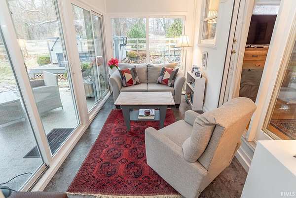 This tastefully and thoroughly updated home on Bloomington's east side has great mid-century style with a cottage twist. Sun shines through the windows of this pristine home on just under 2 acres with a large entertaining kitchen with island and new cabinetry and appliances. This fresh space is combined with the large great room and dining areas for easy breezy hosting. The owners have updated and upgraded the finishes of this home with hardwoods, a primary bedroom suite on the main level with walk-in storage and a swimspa. This three bedroom home has two upper level bedrooms for great study or guest space. There is ideal studio space for creatives and a wonderful lower level storage room with laundry and organizational space for projects. This delightful home has a four season sunroom and beautiful covered outdoor patio area that's perfect to enjoy the pollinator garden and the priceless privacy. There is a charming barn building at the back of the property great for garden tools and off-season storage, parking plus a pet fencing area for convenience. Enjoy all the benefits of the new nature preserve that is being created directly across the street with hundreds of acres of protected land. Additionally, this property is just minutes to Third St and Indiana University access and is adjacent to the Hyde Park neighborhood to the west.