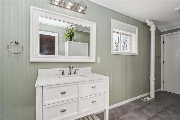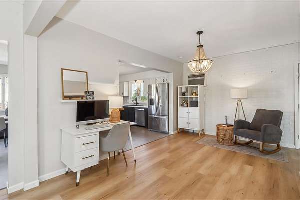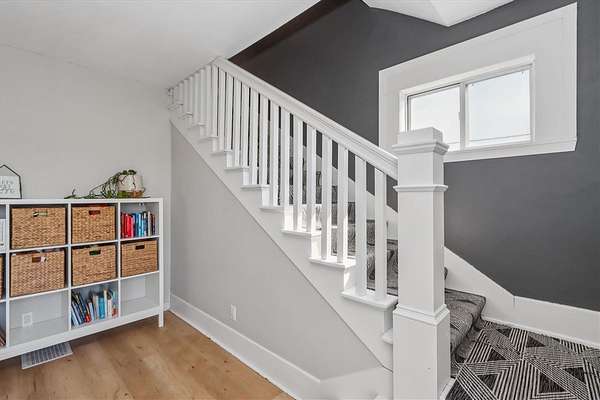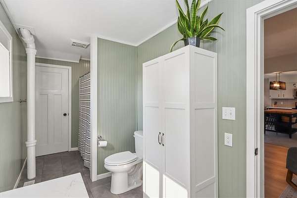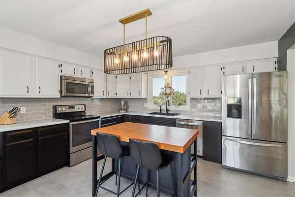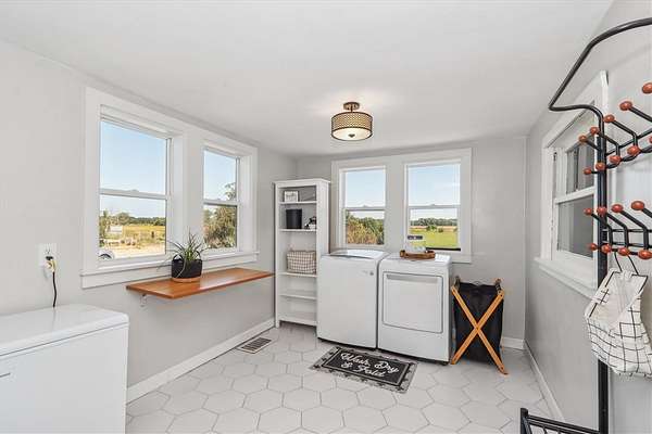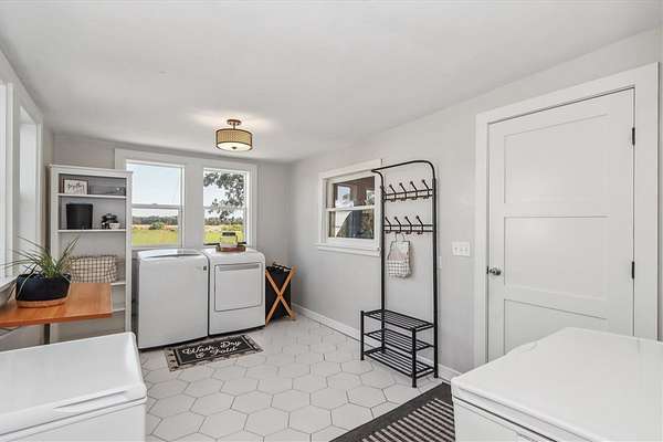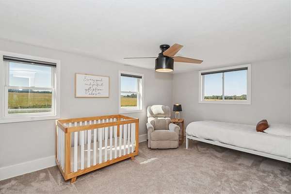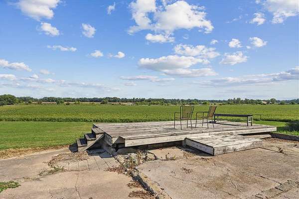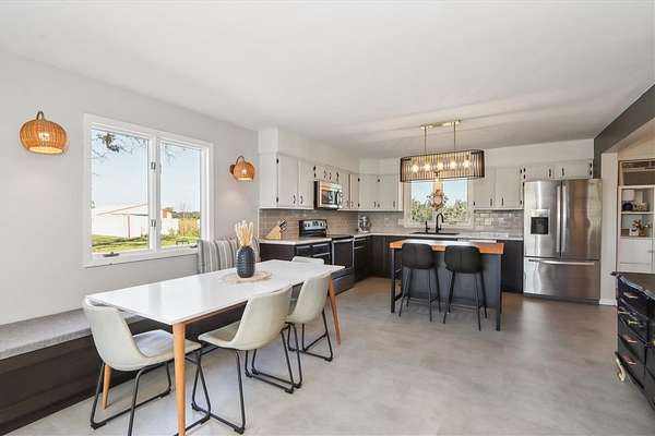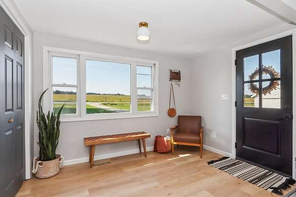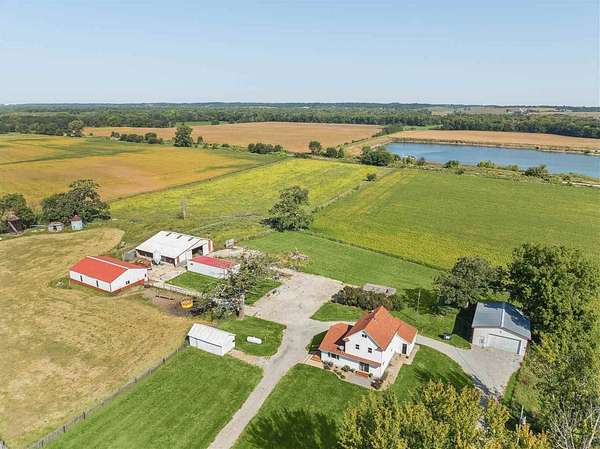 This Iowa county acreage offers a charming retreat with numerous updates and a picturesque setting, making it an ideal property. Situated on just over 9 acres along a hard surface road. Upon entering, the light-filled interior welcomes you, creating a bright and inviting atmosphere throughout the home. The oversized renovated kitchen stands out as a focal point, showcasing a mix of white upper cabinets and dark lowers, stainless steel appliances, stylish backsplash, an island for added workspace, window above the sink offering scenic views, trendy fixtures, and a chic dining space with a built-in bench for cozy meals. The living room features a sliding glass door that floods the space with natural light and leads to a patio. The laundry room, with a hexagon tile floor includes washer and dryer, adds convenience to your daily routines. A full bathroom with a tub/shower, newly updated in 2023, provides a modern and functional space. Moving to the upper level, two spacious bedrooms one with painted hardwood floors offer comfortable space, while a bonus room provides versatility as an additional closet, den, or office, catering to various lifestyle needs. Furnace new in 2020. A two-stall garage and multiple outbuildings offer ample storage space, work area and parking options.