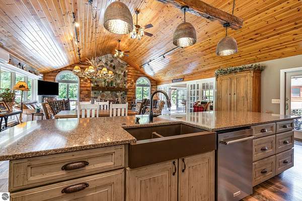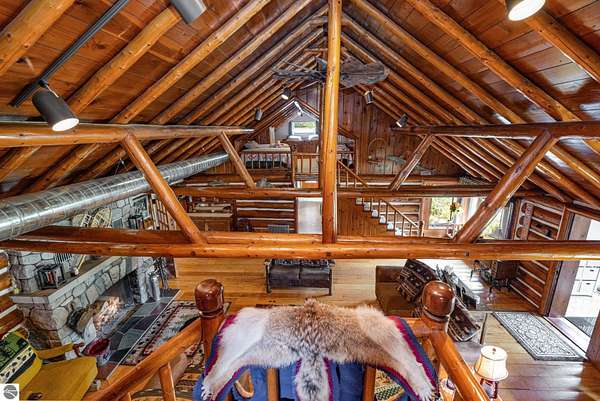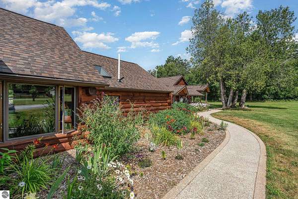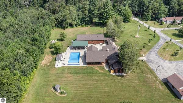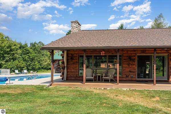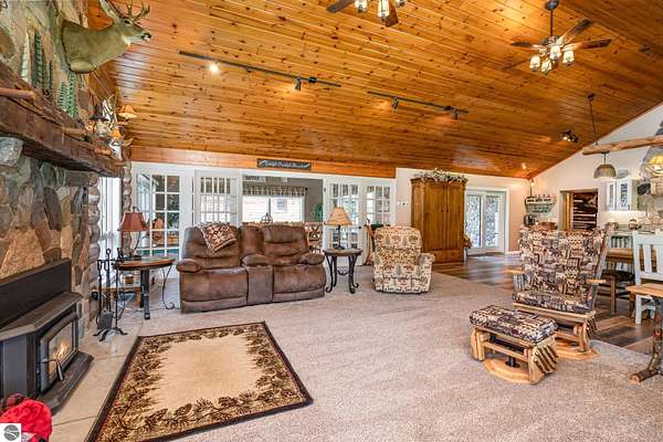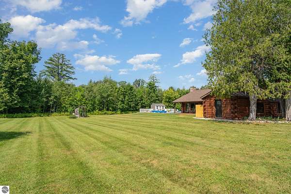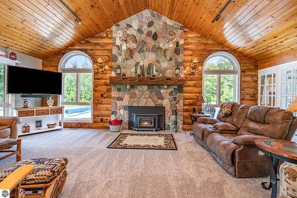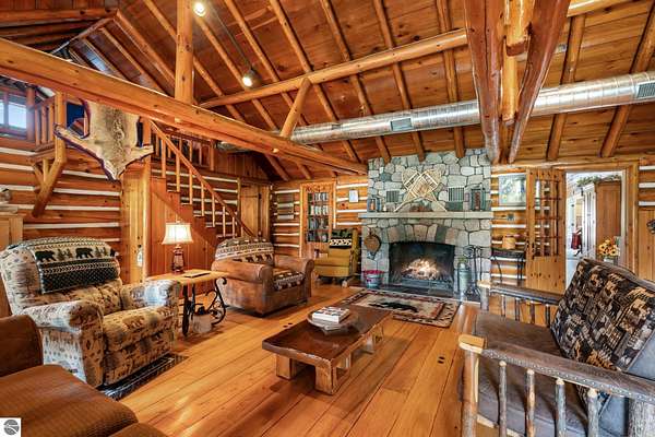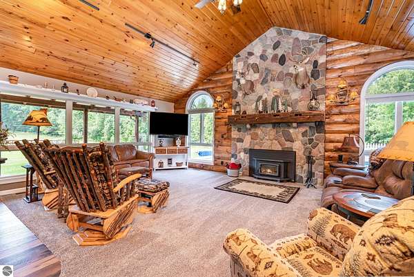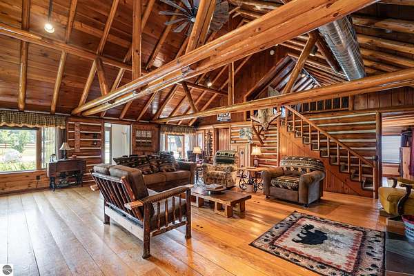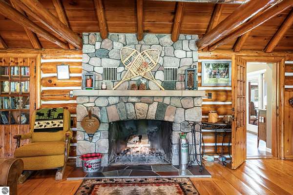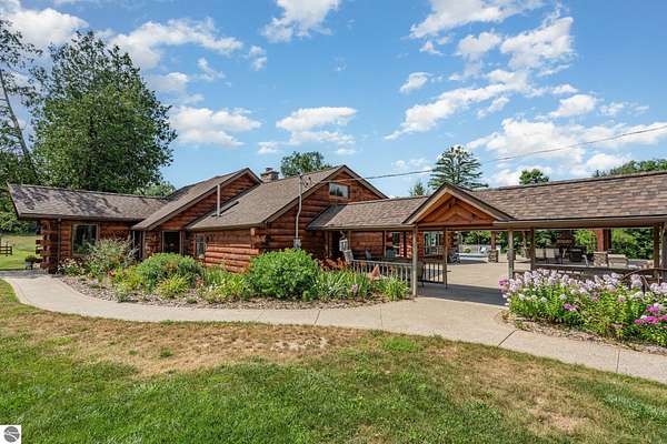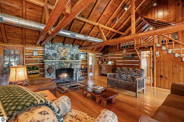 What an incredible find! Nestled in the heart of the Huron National Forest, this sprawling 220+ acre estate sits at the end of a half-mile private drive, bordered by over 20,000 acres of national forest on 2.5 sides. The property features three meticulously updated homes offering more than 6100 square feet of finished living space in all. This includes the original 1920s log home with four bedrooms and two natural stone fireplaces, as well as six additional outbuildings. Floor-to-ceiling windows in the great room offer stunning views of the bountiful, beautiful wildlife. Step outside to a 20x30 pavilion with a stone fireplace, a 20x40 heated in-ground pool, and a pool shed. A 1,400 sq. ft. two-bedroom guest house is connected to the main home by a covered walkway. Across the asphalt drive sits a remodeled caretaker's house, ideal for rental income or guests. All three homes are heated by an outdoor wood furnace and equipped with automatic backup generators. A circle drive includes two 230A 120V RV hookups. The 40x103 pole barn features a 23x40 heated workshop, a 40x80 insulated section with wood stove, new LED lighting, and a 14x19 hunting/sports room with two large gun safes. The horse barn includes three stalls, a tack room with fireplace, and a service garage with roll-up door. Four livestock spigots are supplied by a dedicated well. Adjacent to the barn are two more buildings: a 17x39 garage and a 20x40 pole barn with horse stalls and drying lumber. Enjoy over four miles of wide, maintained trails through rolling fields and forest, six hunting blinds (three with food plots), and frequent sightings of large herds of deer--including impressive bucks. Apple trees on the property keep the deer nearby and offer a perfect fall harvest for homemade pies. This unique and private estate offers much more than can be listed here.