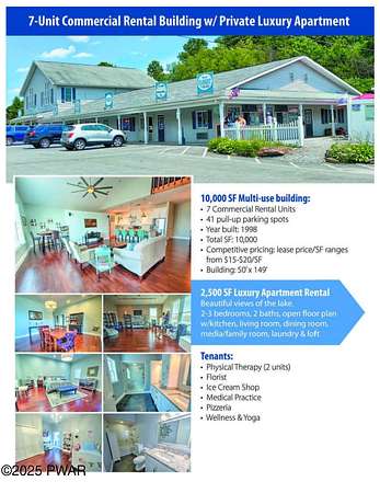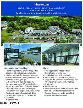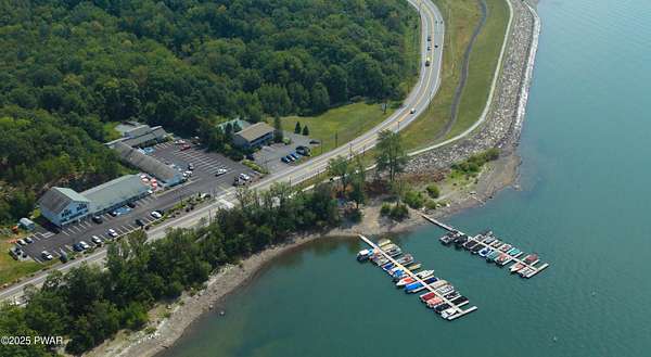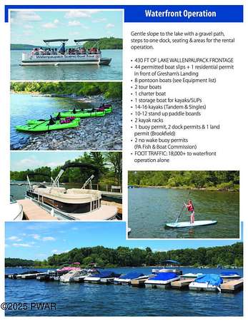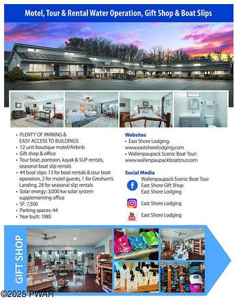 Iconic property for sale on Historic Route 6 with 400+ ft of lake frontage! Boutique 12-unit STR motel, 7-unit commercial rental building, 2,500 SF luxury apartment, tour boat, charter & boat rental operation (pontoons, kayaks & stand-up paddle boards), gift shop, 44 boat slips, undeveloped mountain with amazing lake views, and directly bordering 2,000 acres of state game land. Building 1 - Gresham's Landing: passive income with the 10,000 SF multi-use building that includes 7 units, 41 parking spots, and a 2,500 SF luxury apartment rental - building is fully occupied. Building 2 - East Shore Lodging: 12-unit boutique motel set up as a STR with contactless check-in and keyless entry. The building also includes a gift shop and booking center for the water operation. The waterfront operation is located across the street on 2 boat docks and includes 2 tour boats, 1 charter, 8 pontoon rentals, 14 kayaks, 10 stand-up paddle boards, and 2 kayak racks. Infrastructure includes a highway occupancy permit, state-permitted crosswalk, wireless camera system, solar panels that power the office, 2 wells, and 2 newly topped septic beds (July/August 2025). Sale includes 2 buildings, shed, watercraft & equipment, docks, Kubota, room furniture (list can be provided). Property is located across from the Observation Dike, Lake Wallenpaupack Nature Trail, and the Visitors Center - centrally located for Wally Lake Fest, Hawley Winterfest, and the 4th of July Fireworks!