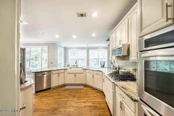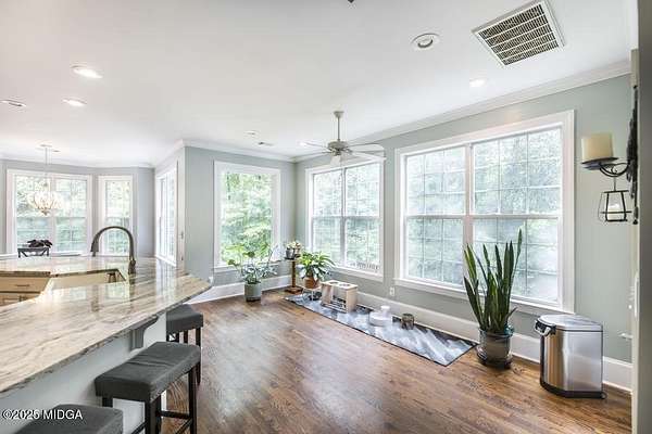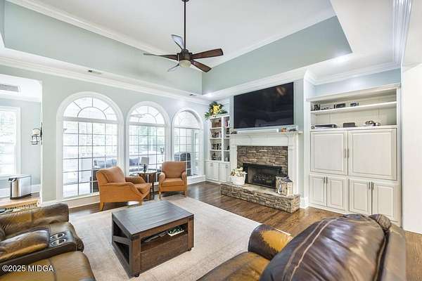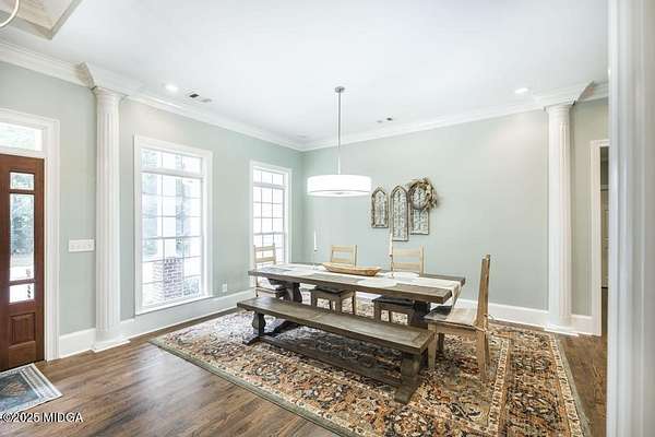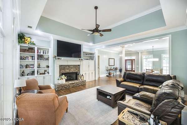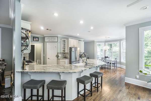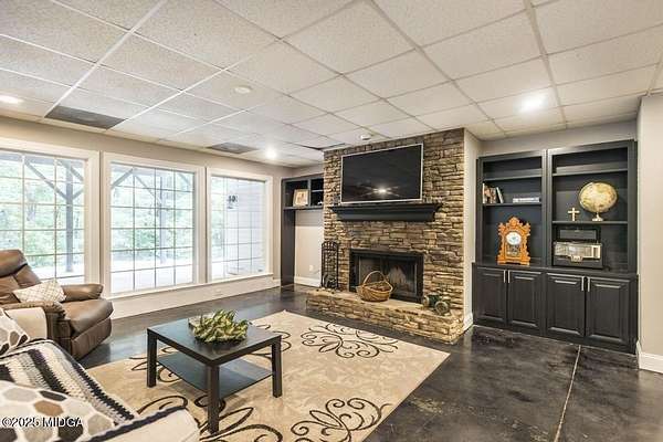 This is your opportunity to own a private riverfront retreat on 14.89 acres in beautiful Monroe County. This stunning 6-bedroom, 4.5-bath home offers the perfect balance of peaceful country living with convenient access to Forsyth, Jackson, and Macon. Inside, you'll find an open-concept main level with hardwood floors and 10-foot ceilings, creating a bright and inviting atmosphere. The spacious kitchen features granite countertops and flows into the living areas and formal dining room--ideal for gatherings and entertaining. The living room serves as the heart of the home, offering plenty of space to relax around the fireplace. Enjoy your mornings or evenings on the back deck or unwind in the enclosed sunroom overlooking the property. The main-level primary suite provides a private retreat with dual vanities and a soaking tub. Two additional bedrooms and a full bath on this level offer flexibility for family, guests, or a home office. Upstairs, a private guest suite with its own full bath creates a comfortable space for visitors or extended family. The walk-out basement expands the home even further, featuring two bedrooms, an additional suite with a full bath, a kitchenette, a fireplace, and abundant storage. A large bonus room offers the perfect opportunity for a media room, gym, or hobby space. Outdoors, the property truly shines with approximately 500 feet of Towaliga River frontage, complete with a canoe slip for kayaking and a cleared area ideal for relaxing, entertaining, or enjoying nature. A small creek winds through the wooded landscape, adding to the property's charm. The fenced front section is perfect for a garden or mini-farm. With a circular driveway, scenic surroundings, and plenty of space to spread out, this property offers privacy without sacrificing convenience. A rare find for those seeking land, water, and a beautiful home all in one.