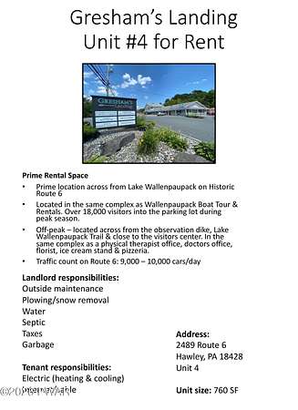 Prime 760 SF commercial space for lease at Gresham's Landing, 2489 Route 6, Unit #4 in Hawley, directly across from Lake Wallenpaupack on Historic Route 6. This highly visible location sits in the same complex as Wallenpaupack Boat Tour & Rentals and benefits from strong seasonal traffic, with over 18,000 visitors entering the parking lot during peak season and approximately 9,000-10,000 cars per day passing on Route 6. The property is also across from the Lake Wallenpaupack observation dike, the Lake Wallenpaupack Trail, and near the visitors center, surrounded by established neighboring businesses including a physical therapist office, medical office, florist, ice cream stand, and pizzeria. Landlord covers outside maintenance, snow removal, water, septic, taxes, and garbage, while tenant is responsible for electric (heating and cooling) and internet/cable, making this a convenient and well-positioned opportunity for a small business or professional office. Owner is a license real estate broker.
