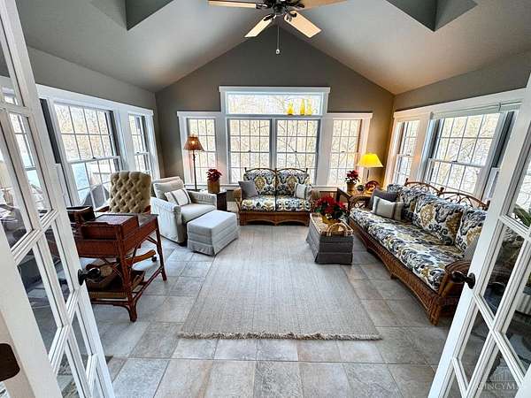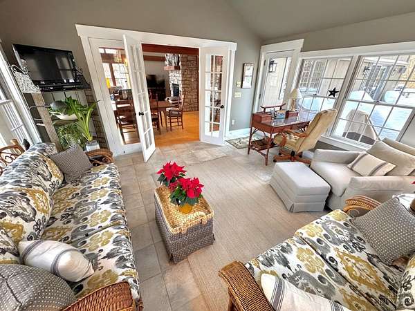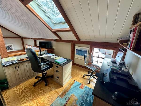 - 9 Ft + Ceiling, Beam Ceiling, Cathedral Ceiling, French Doors, Multi Panel Doors, Natural Woodwork, Skylight, Vaulted Ceiling