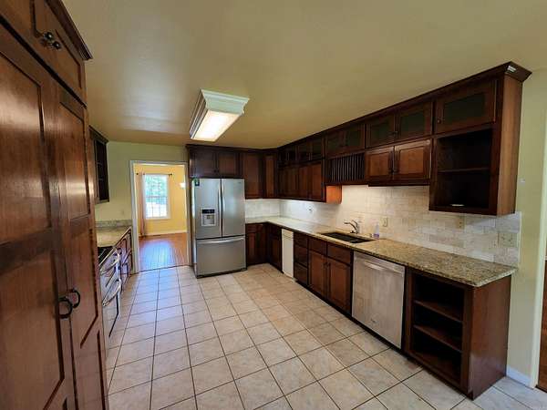Tucked away on just over 14 peaceful acres, this country home offers privacy, space, and thoughtful features throughout. A concrete driveway leads from the road to the home, which includes a two-car carport plus extra parking. The main level features a primary bedroom, separate dining area, office, and a wrap-around covered porch ideal for enjoying the outdoors. Inside, you'll find granite countertops, custom cabinets with under-cabinet lighting, tall ceilings, a large living room, and a real wood-burning fireplace. The home boasts two newer HVAC systems, and utilities include city water plus a well. French doors open to a detached 488 sq ft cabin with a full bath and kitchenette. outdoor storage and plenty of room for fresh gardens ro be grown!