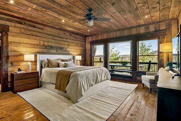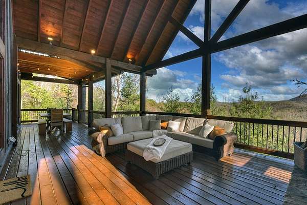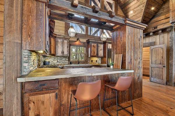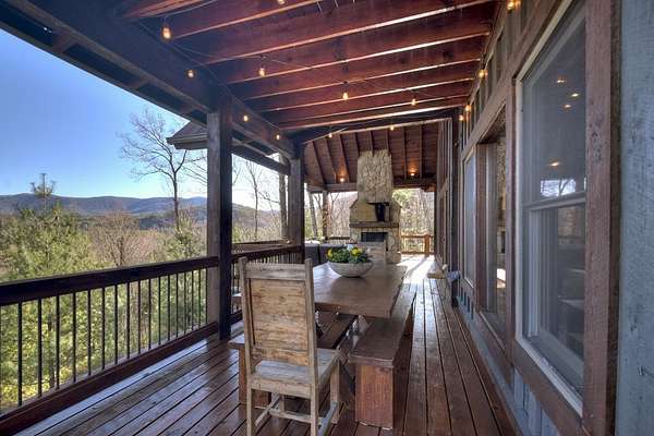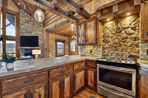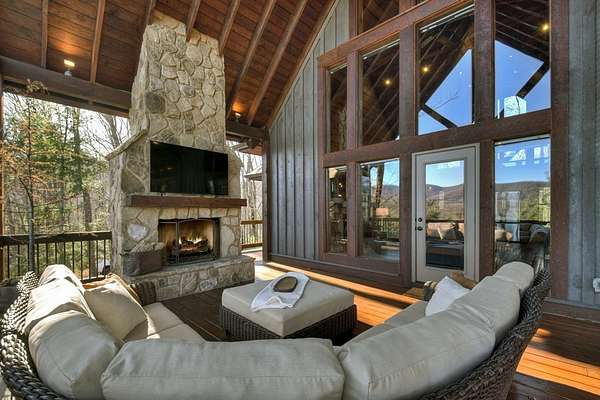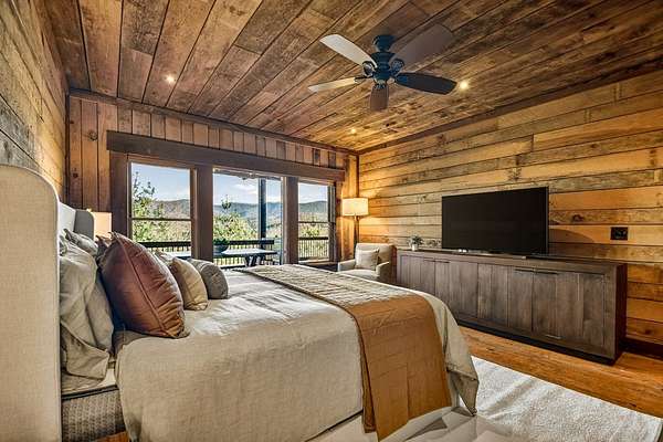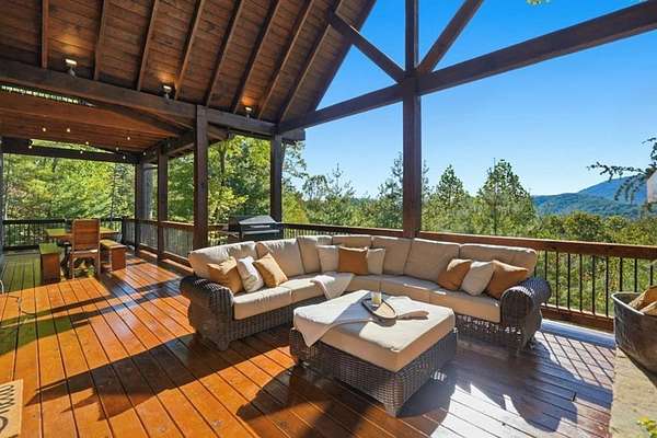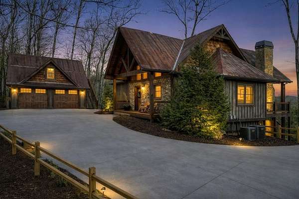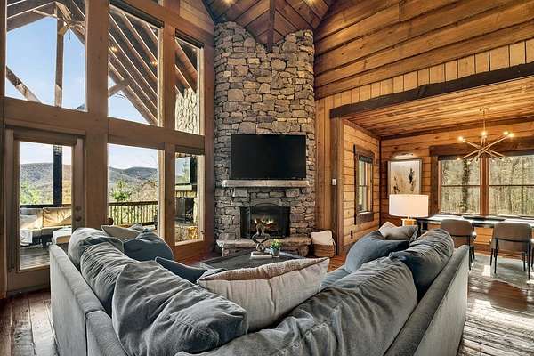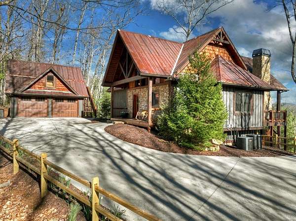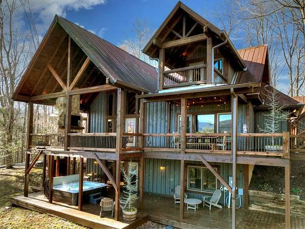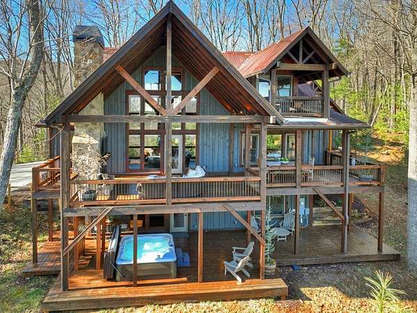 Experience the perfect blend of luxury, privacy, & breathtaking YEAR ROUND VIEWS in this stunning, PROFESSIONALLY FURNISHED, TURN KEY 3 BEDROOM/3.5 BATH custom-built Keith Sumner Mountain Retreat. Set on 3.2 acres of private mountain beauty, within a gated community, this home is just minutes from down Blue Ridge. This home offers it all—from ample parking & an oversized 2-car detached garage w/ large upstairs storage, to a striking exterior featuring stacked rock, wood, cedar shakes, board & batten, & a metal roof, all surrounded by METICULOUS LANDSCAPING. Enjoy an almost stepless entry leading to a covered rocking chair front porch w/ vaulted ceiling. Inside, the great room showcases a wall of windows capturing the views, circle sawn hardwood floors, a floor-to-ceiling rock gas log fireplace, & a cathedral ceiling designed to highlight the mountain backdrop. The kitchen is a showstopper w/ custom two-tone cabinetry, hardy stone counters, stacked rock & flagstone accents, & a unique covered bar area, flowing into a spacious dining area w/ modern lighting. Step outside to a dream outdoor living space w/ a wood-burning fireplace & plenty of room for relaxing or entertaining. The main level oversized master suite features stunning views, an ensuite bath w/ a flagstone shower and an actual rock waterfall to create a unique spa-like bath experience. Upstairs offers a second master suite w/ a private covered deck & an ensuite bath w/ a double vanity & oversized rock shower. The terrace level includes a wet bar, a large family/game room w/ a rock gas log fireplace, and a third oversized bedroom with a full bath. Outdoor living continues w/ a large covered deck featuring space for relaxing and a saltwater hot tub w/ massage jets, lighting & sound, an outdoor shower, & a large storage room w/ power, heat, and air, which has access from the deck. Previously a successful rental, this exceptional property offers the ideal blend of luxury, comfort, & investment potential.