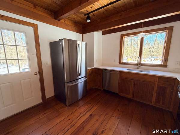 This cozy Washington cottage has a lovely rustic charm. Newly painted and new appliances it's sparkling clean. It offers 2 bedrooms, 2 full refreshed baths and features beautiful wide-board wood floors, a striking 2-story stone fireplace, and vaulted ceilings that fill the space with light. Set back from the road on 4.6 peaceful acres, it offers privacy and a welcoming front porch. Just minutes to Washington Depot, New Preston, The Mayflower Inn and the town beach on Lake Waramaug. Shared driveway.
