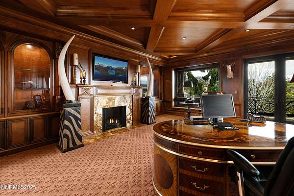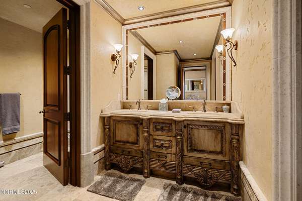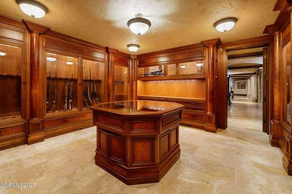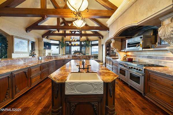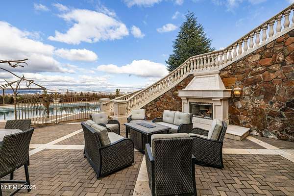 Set on an extraordinary 14 acres in the heart of Reno, the Pennington Mansion stands as one of Nevada's most iconic trophy estates. Properties of this scale simply do not exist this close to town, offering unmatched convenience paired with absolute seclusion, commanding elevation, and arguably the finest city views in all of Reno. Perched on a high plateau, the residence overlooks the entire skyline and valley, delivering cinematic, unobstructed vistas by day and a dazzling city-light show by night. A dramatic rotunda entry with soaring Venetian plaster ceilings sets the stage, opening to a grand living room anchored by a statement fireplace and floor-to-ceiling windows framing those signature views. The home spans 19,000+ square feet of refined living space, crafted with rare stones, exotic woods, and globally sourced materials. Its impeccable, ornate craftsmanship is designed to astonish even the most discerning buyer. Woven into every inch of the estate are coffered and barreled ceilings, ironclad windows wrapped in dramatic drapery and enhanced with custom automatic shades, gorgeous multi-step baseboards and moldings, solid-core grand entry doors finished with limestone trim, and grand-scale architectural columns. The west wing hosts a resort-caliber primary suite complete with a sitting room, one-of-a-kind custom onyx fireplace, private veranda, spa-style bath with multi-step finished cabinetry, his and her commodes, and a sumptuous walk-in closet with private laundry and fully enclosed custom wardrobes, delivering an elevated, boutique-inspired dressing retreat. A richly appointed executive office with warm burl wood box-trim paneling, custom cabinetry, built-in bookshelves, glass-front display cases, a fireplace, and patio access completes this wing. The east wing is designed for unparalleled entertaining. A circular sunken bar connects seamlessly to a stone-lined wine cellar and billiards room. The chef's kitchen features open truss ceilings, leathered stone countertops, a Wolf range, a large dining hearth, a butler's pantry, and a separate back kitchen, ideal for large gatherings or catering. A showstopping circular formal dining room offers a dramatic setting for intimate dinners or major social events. The home's lower level, accessed via a grand staircase or elevator, expands the lifestyle footprint with three generous ensuite bedrooms (each opening to poolside patios), a full home theater with snack bar, a large gym with salon, a craft room, and a secured gallery room for the curated display of historic arms, militaria, or other distinguished collections. Beyond the primary living areas, the estate offers over 7,000 sq ft of additional utility and storage space integrated into the daylight basement, an incredibly rare amenity for a property of this stature. Plentiful garage space totaling 2,600+ sq ft accommodates eight vehicles with ease, complemented by expansive motor-court parking for dozens more. Outdoors, the meticulously manicured grounds are introduced by a gated entrance that ushers you in along a newly resurfaced, estate-length driveway that winds gracefully toward the residence, framed by mature trees and lush, established landscaping. The setting unfolds into statues, a grand fountain, sprawling lawns, an in-ground pool and spa with built-in kitchen, and yet another monumental fireplace to complete the outdoor space. As a Nevada residence, ownership also provides highly attractive tax advantages, including no state income tax, no inheritance tax, and comparatively low property taxes, making this property not only a statement estate, but a strategic one. Rarely does a home combine iconic architecture, unmatched acreage, total privacy, and immediate city access like this. The Pennington Mansion is more than a residence; it is Reno's ultimate trophy property.