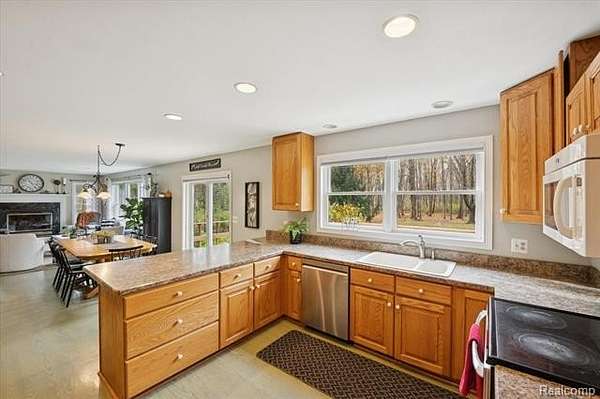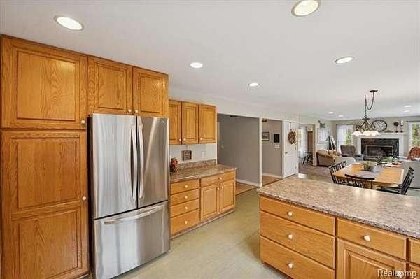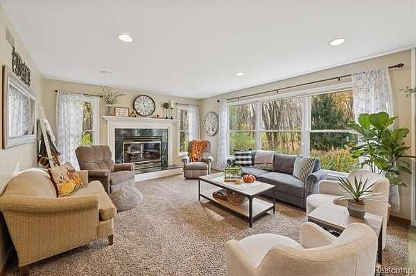 Inside, an inviting open-concept layout features multiple living spaces filled with natural light. The main living room showcases large windows overlooking the private backyard and a striking fireplace that serves as a warm focal point. The spacious kitchen provides ample cabinetry, stainless steel appliances, and generous counter space, flowing seamlessly into the dining area and family room.