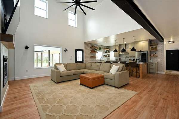 If you have been watching and waiting to make your move now is the time. Large Price Improvement. Built in 2020, this contemporary farmhouse sits on 7.89 acres. Located on the edge of Johnson County and Shawnee city limits, this unique property is perched on a bluff that overlooks the Kansas River bottom. 6600 total sq feet, open floor plan with custom touches and amenities, exposed beam, whole home audio system, large pantry, and lots of usable space. 4500 Sq ft above ground with so much to offer! Main level has an office, sitting/piano room, open living/kitchen area, fireplace, large laundry/mudroom, and primary suite with sky lights, a large bath/custom closet, digital shower, and additional office space. Upstairs you'll find 4 bedrooms, 2 full baths, a reading nook, a large play/toy room with a slide to the lower level, and an additional laundry room. The basement is 2100 sq ft and is fully finished with 2 additional bedrooms, 1 full bath, 9ft ceilings, and a large gym. The 1100 sq ft, well-lit garage is epoxied and comes with a wash tub and urinal. In the back yard you will find a covered porch that extends to a lower level with two fireplaces and a TV mount, a basketball/pickleball court with stadium lighting, grass with an in-ground sprinkler system and plenty of room for a pool. The front yard has a temperature controlled she shed, raised planter boxes, and a 10-tree fruit orchard, all on an automated water system. There is approx. 4 acres of available land for pasture/grazing along with a unique padded out area for a 50ft x 80ft+ shed/barn. The home also has a built-in fire sprinkler system, water softener, 2 water heaters (one is tankless), and whole home water filtration.