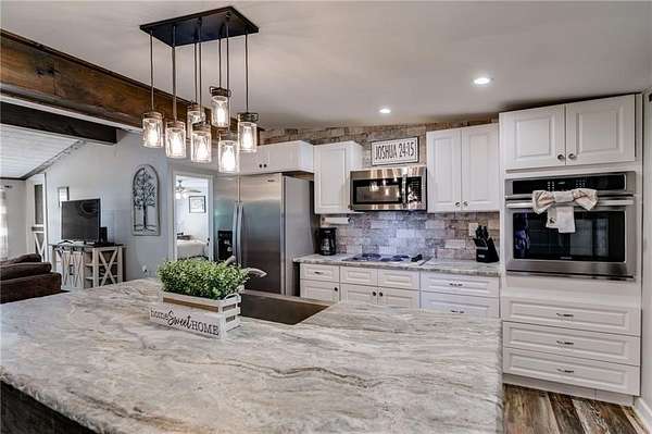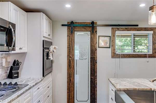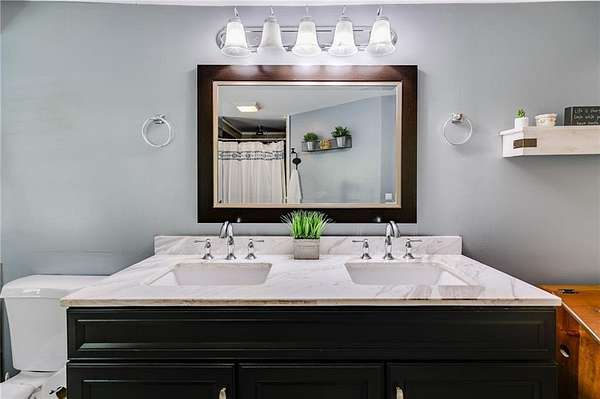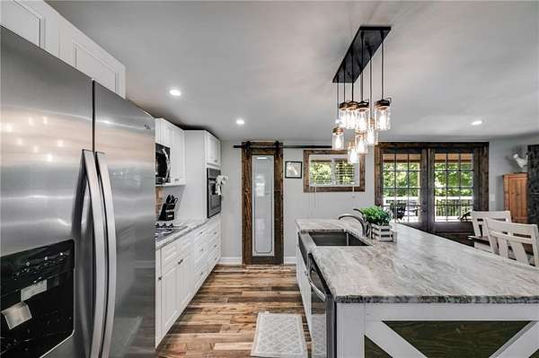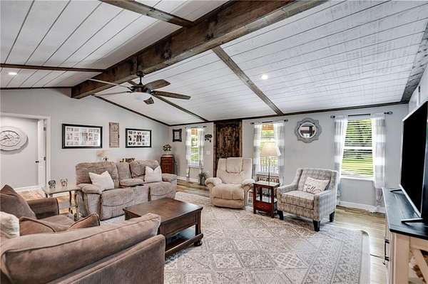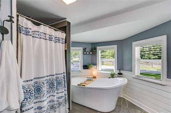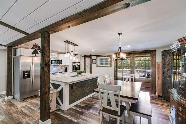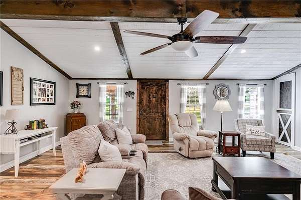 Welcome to this beautifully updated ranch-style farmhouse sitting on 3.19 acres in one of Carrollton's most sought-after areas! This 3 bed, 2.5 bath home perfectly blends modern touches with timeless charm. Step inside to find LVP flooring throughout, soaring ceilings in the main living area, and a fully updated kitchen featuring stainless steel appliances and a walk-in pantry. All bathrooms have been stylishly renovated with custom stonework in the showers, and the primary bedroom boasts a spa-like en suite with a soaking tub, walk-in closet, and serene lake views. Enjoy the outdoors on the expansive deck that wraps around the back and side of the home, or explore the creek at the edge of the property. There's also a fenced side yard, an unfinished basement ready for expansion, and a detached garage/workshop with electrical/RV hookup. All this just 5 minutes to shops and restaurants and under 10 minutes to downtown Carrollton. Don't miss your chance to own a piece of peaceful, country living close to everything!