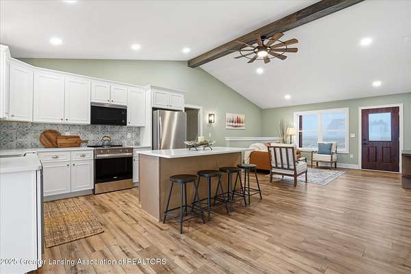 - Beamed Ceilings, Ceiling Fan(s), Double Vanity, Eat-In Kitchen, High Ceilings, Kitchen Island, Open Floorplan, Pantry, Recessed Lighting, Smart Thermostat, Stone Counters, Vaulted Ceiling(s), Walk-In Closet(s)