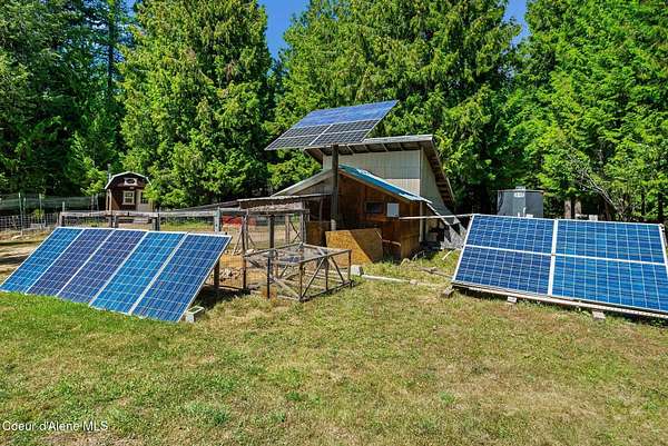 This 1,344 sqft off-grid 3BD/1BA home with a Guest Tiny Home on 7 secluded acres boasts stunning Selle Valley & Selkirk Mountain views, with Schweitzer Ski Resort as your backdrop! Nestled at the top of Gold Creek Ridge just NE of Sandpoint, this modern turn-key smart-cabin offers unmatched privacy and seclusion that accompanies other remote properties. Enjoy sustainable living with solar power, 14,400kWh of lithium Battle Born Battery storage, and automated generator backup, along with two woodstoves, propane heat, a drilled well (100' depth, 18' static level, freeze-proof hand pump), and septic. The well-insulated home ensures efficient firewood consumption, while the spray-foam-insulated Tiny Home Guest Cabin provides cozy accommodations with wood heat and electricity. The interior features reclaimed oak floors, a vaulted master suite with private balcony, walk-in closet, and mini wood stove. Outside, discover old-growth cedars, fruit trees, fenced garden spaces, a chicken coop, carport, tool/storage sheds, fire pit, and a tree fort. The basement includes a root cellar with an in-ground cistern, plus ample workspace and storage. Situated at the end of the road, this property ensures total privacy amid abundant wildlifewith no CCRs or HOAs to restrict your freedom. A true recreational paradise, it's the perfect blend of modern off-grid living and breathtaking natural beauty.