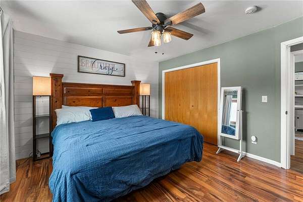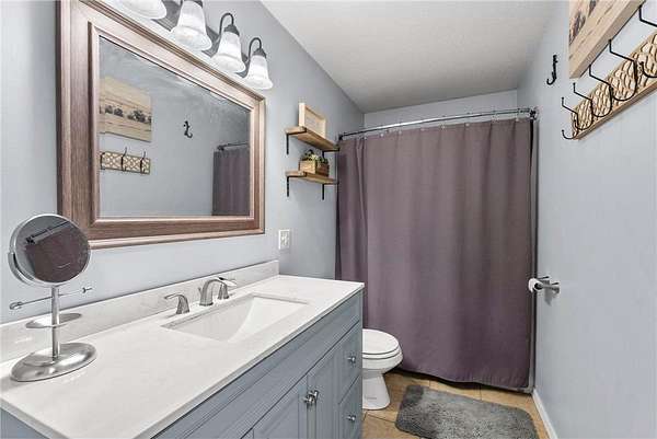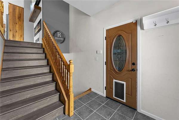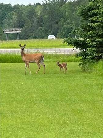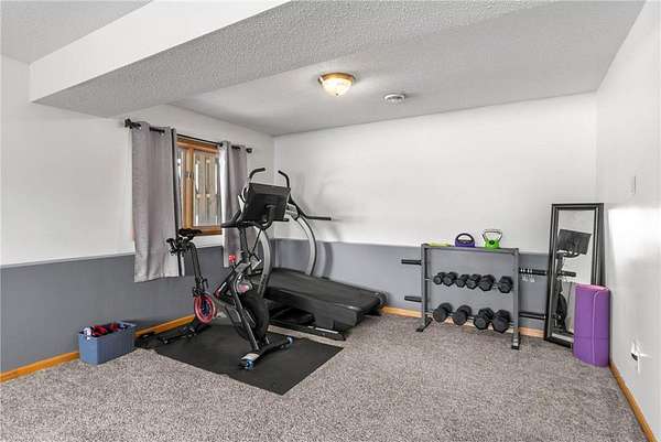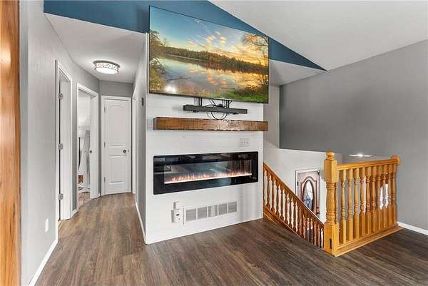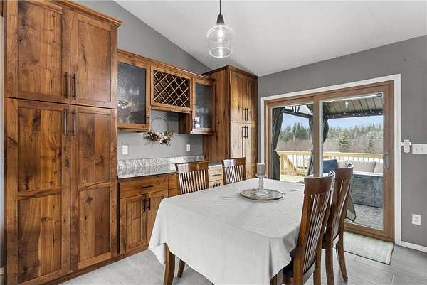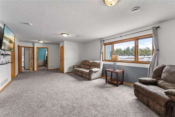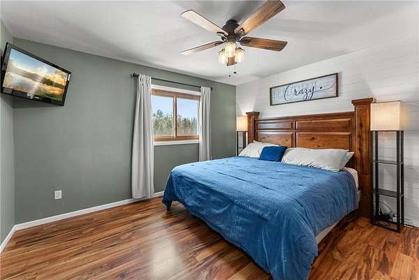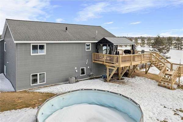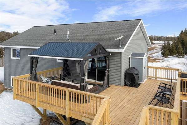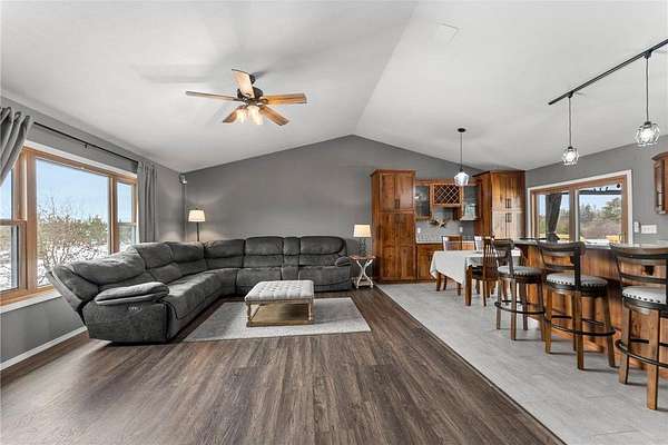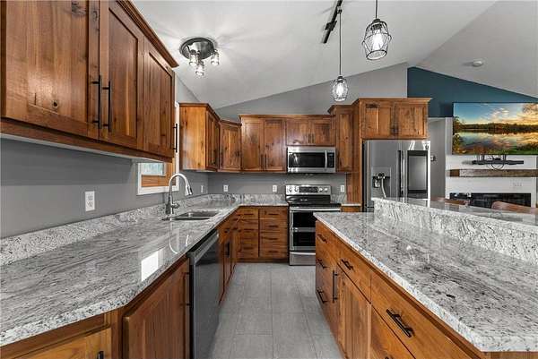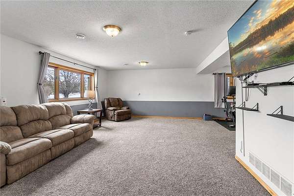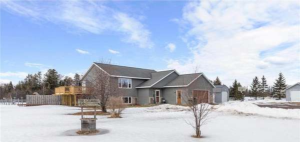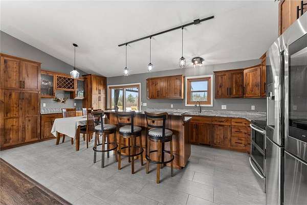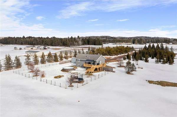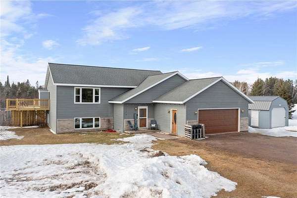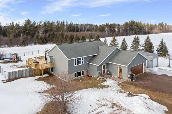 Beautiful acreage property with a recently renovated kitchen (2022) with granite counter tops, rustic black walnut cabinets, center island/breakfast bar area... stainless steel appliances, smart refrigerator and smart sink... Slow close cabinets, pull out pantry cupboards, waterproof vinyl kitchen and dining floors. Open kitchen dining and living with vaulted ceilings. New deck in 2025 with 24x26 at its longest points. Steel deck gazebo deck can be included. 4 BR, 2 BA Split entry, wooded lot on riverfront, 3 miles from I-35. Large lower level family room. 2 BRs on each level and a full bathroom on each level. Fenced backyard and plenty for yard space to enjoy your hobbies. Room for some animals or an outbuilding... 2 stall Heated/Insulated garage 23x23 with in floor heat and new steel insulated garage door. Also two storage sheds. 12x20 Old Hickory Built shed and another 12x12 shed. Appliances included. Beautiful property inside and out.
